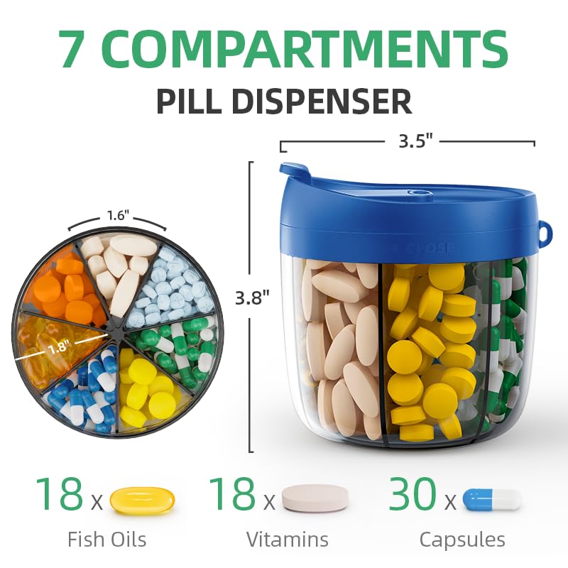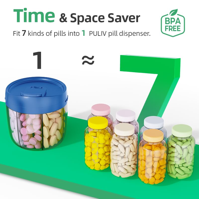 Hold 7 Supplements in 1 Bottle: The PULIV pill organizer weighs just 5.4 ounces and features 7 large compartments. Each compartment can hold up to 18 fish oils to meet your health needs easily, and each fish oil measures 0.9" in length. It has a height of 3.8" with a lid diameter of 3.6" and a base diameter of 3.0". Store 7 different supplements in the 1 pill bottle. Your ideal time and space saver