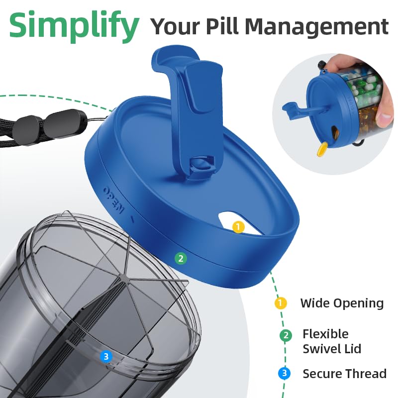 Easy to Access and Load Pills: The pill container adopts a smooth thread and lid that can swivel flexibly, and the wide opening is user-friendly for pill access. With the above 3 thoughtful and unique designs, the large pill organizer makes filling and taking medications effortlessly