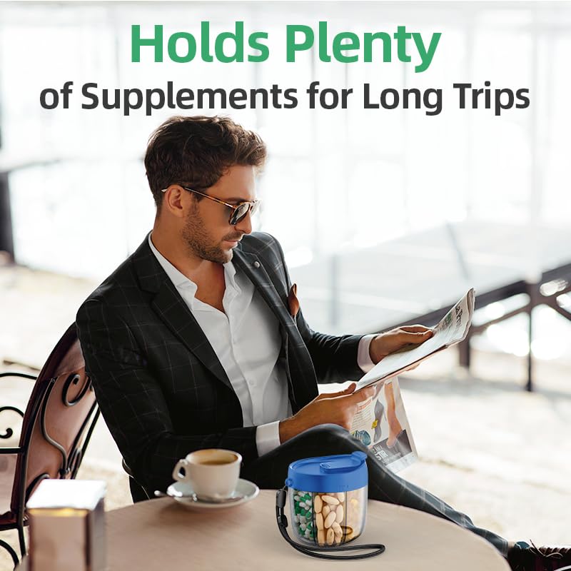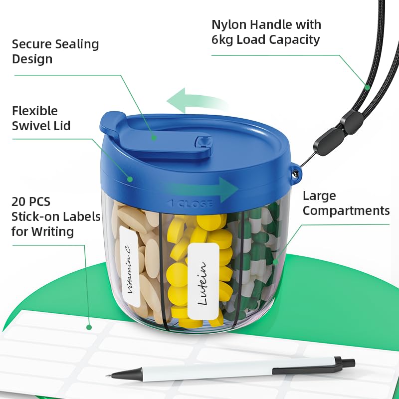Portable Pill Holder for Travel: The travel medicine organizer has a quality nylon handle strap with a 6kg load capacity, making it easy to carry around. It comes with 20 blank stickers to help you record pill details and take pills on time according to dosage when traveling. The supplement organizer bottle is your ideal travel assistant