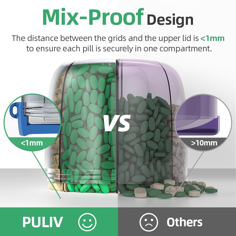 Say Goodbye to Mixing Pills: PULIV portable medication organizer with the design that the distance between the grids and the upper lid is close to ensure anti-mixing pills. Stop being troubled by pills mixing when pouring. Please note: This organizer is not suitable for storing gummy vitamins. For optimal use, store in a dry place and avoid direct sunlight exposure