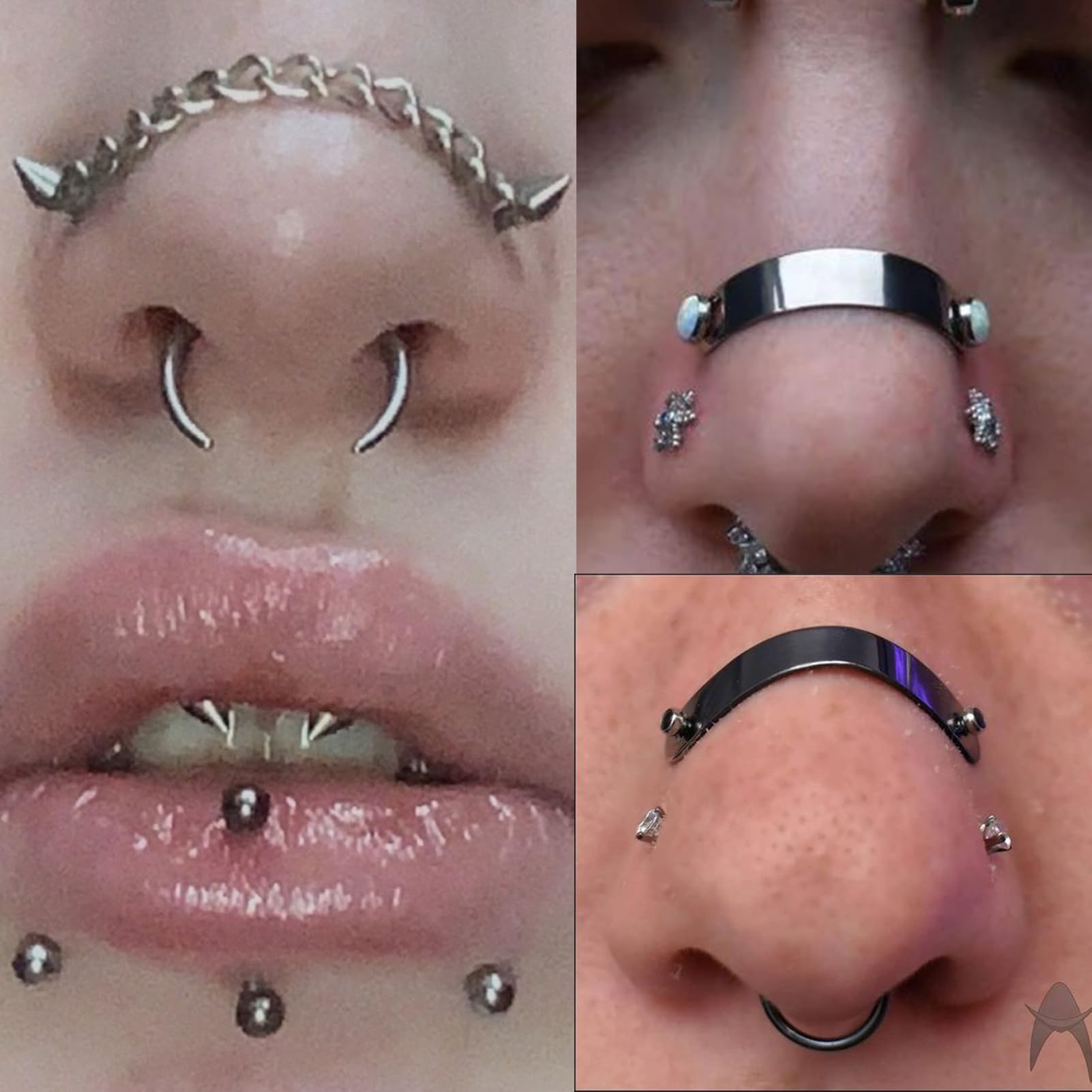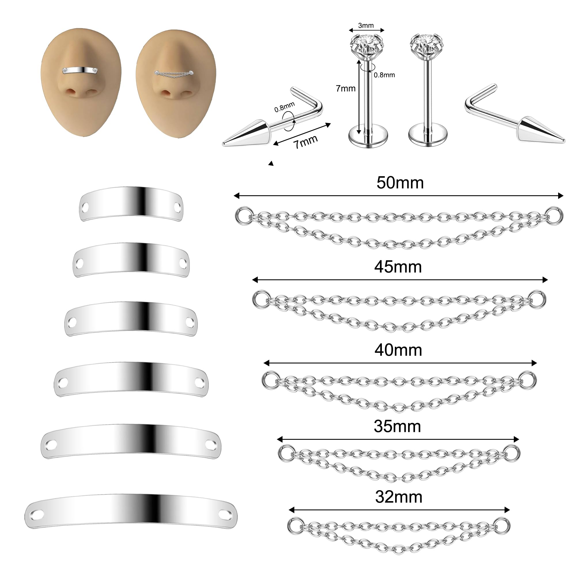 ★【Usage】: Simple and convenient to wear, this nostril jewelry set is used for double or multiple nose piercing. It is connected to nose ring nails, fake nose piercing, nostril hoops, earrings, etc. with a chain, without the need for any tools, and can be worn independently.
