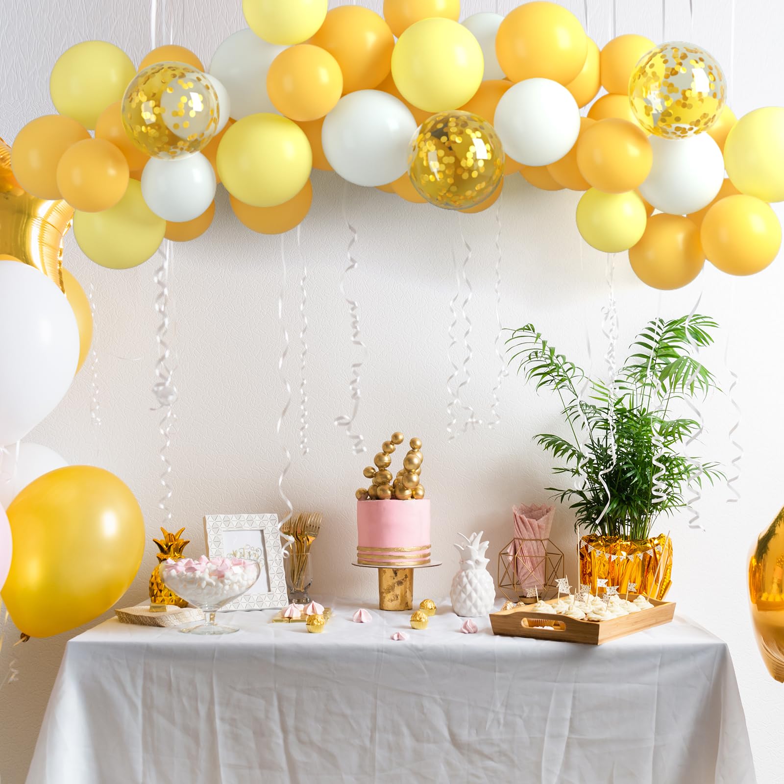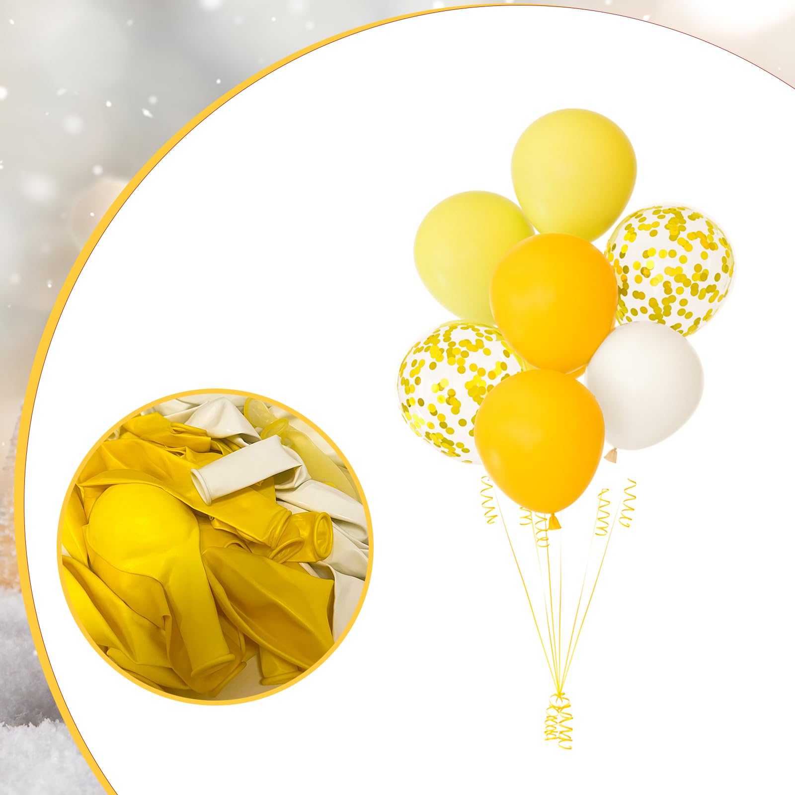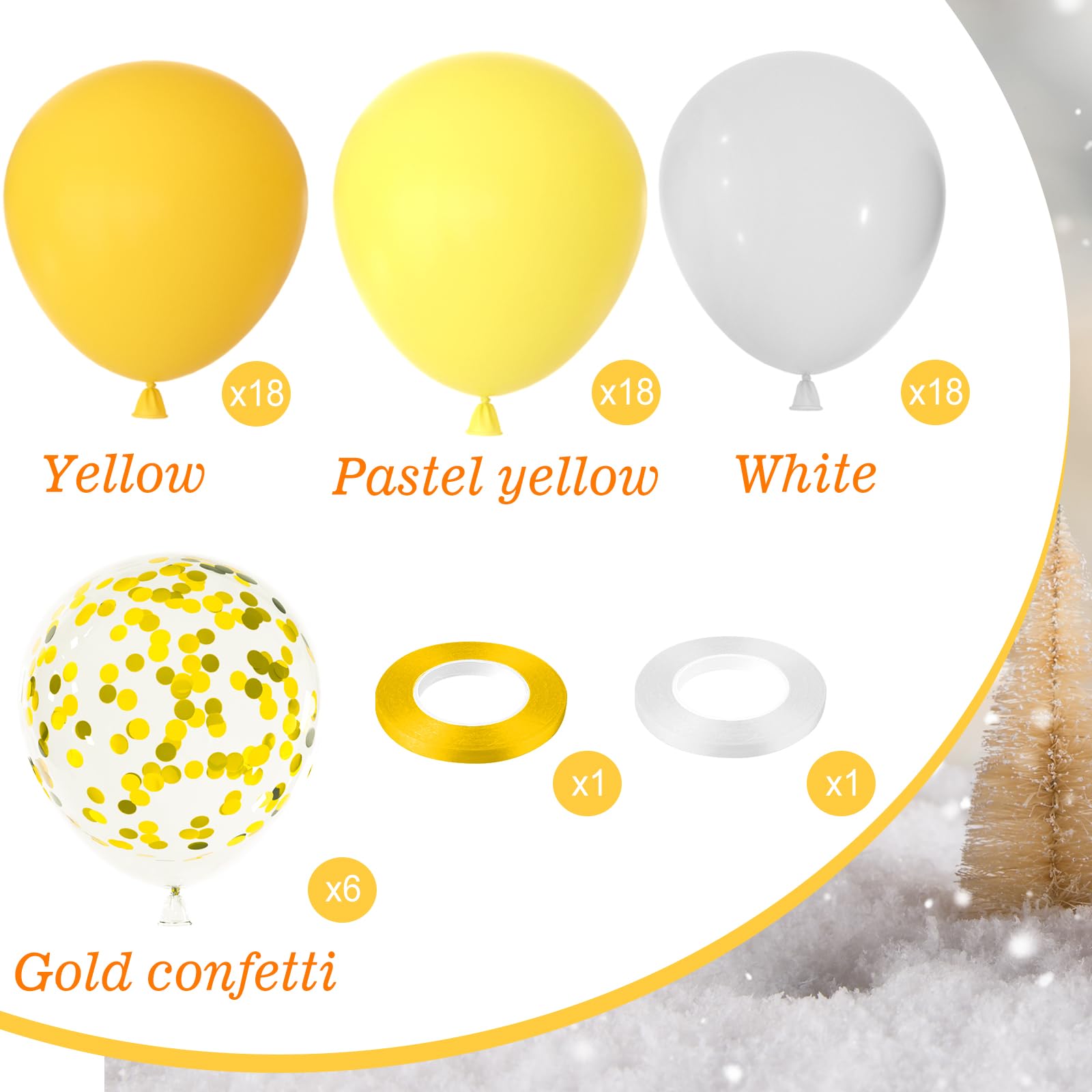 Yellow balloons set: This balloon kit includes 18pcs yellow balloons, 18 pcs pastel yellow balloons, 18pcs white balloons, 6pcs confetti balloons, and 2pcs ribbons yellow and white