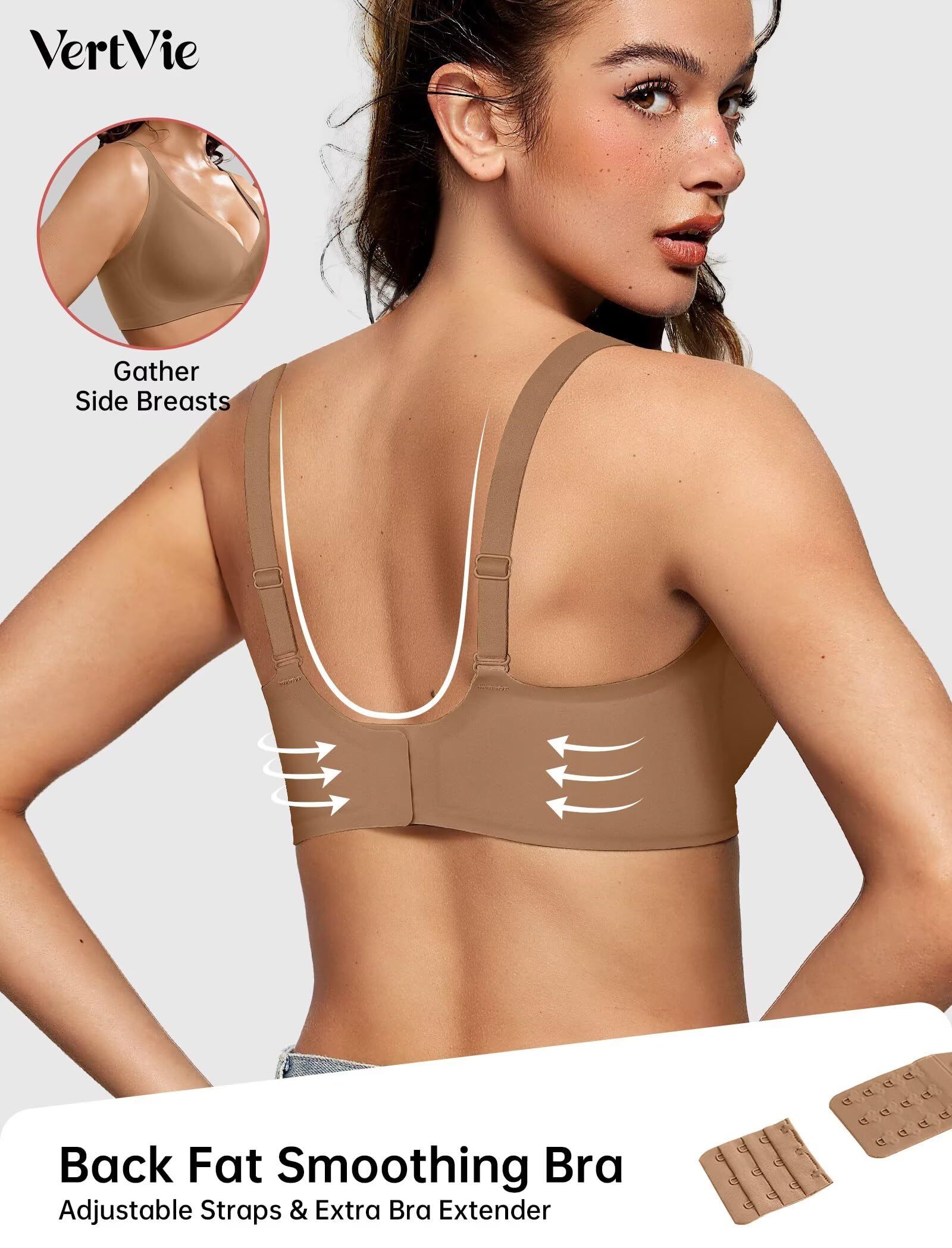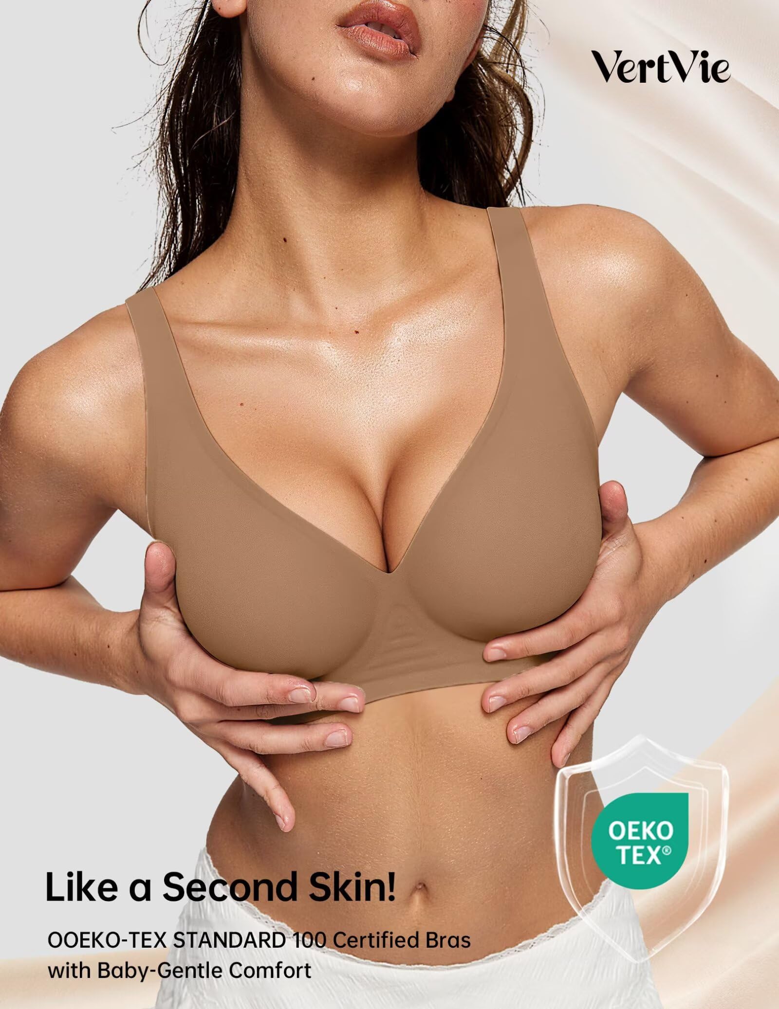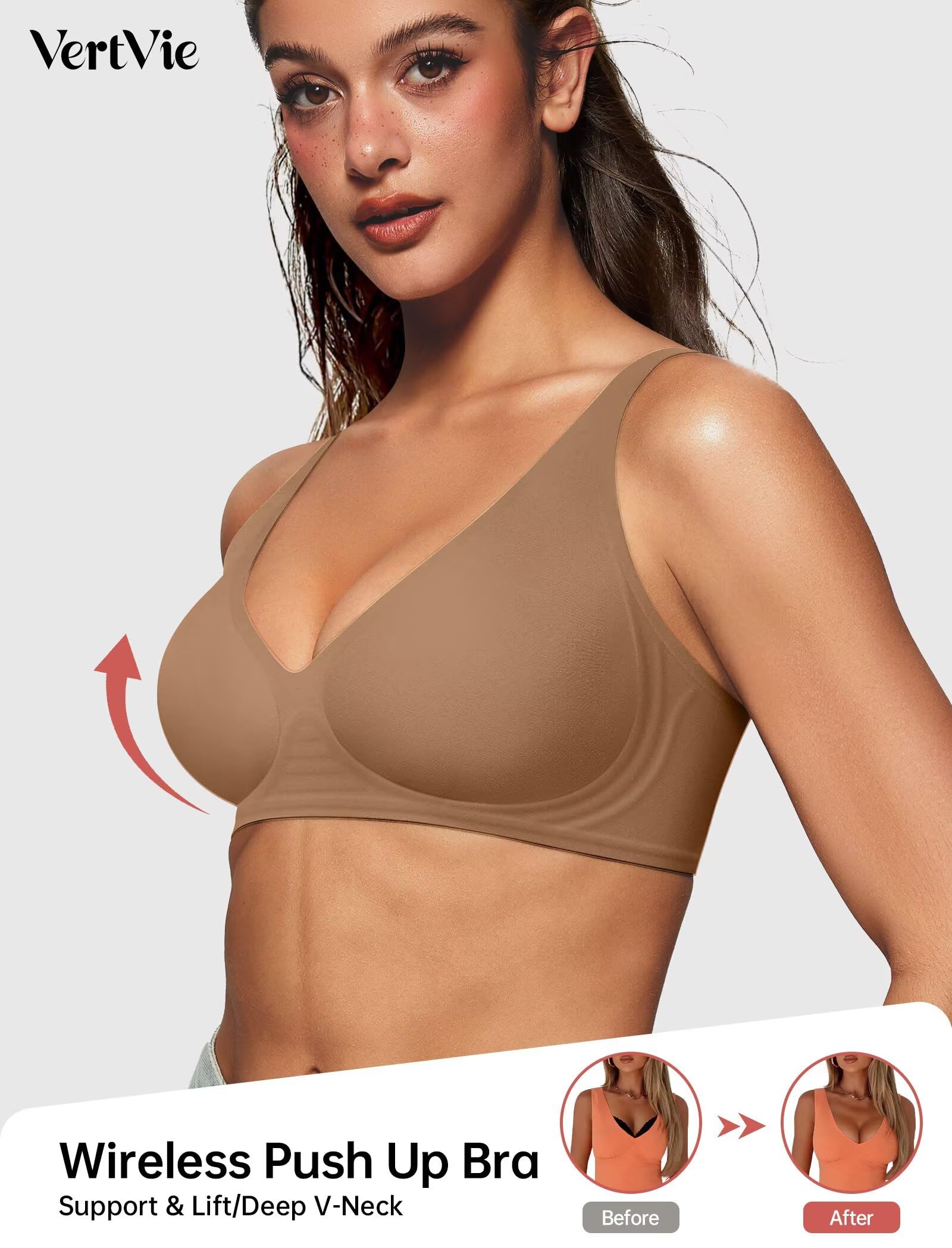 【Sexy Deep V Neck Bras】Discover the allure of our stylish plunge bra! Designed to enhance your natural shape, this full coverage bralette features a plunging neckline that offers a sexy, elegant look and enhances your natural cleavage. Its design makes it perfect for pairing with low-cut tops and dresses, adding a touch of sophistication to your outfit. The VertVie wireless comfort bra will be your new favorite style with its smooth, invisible look.