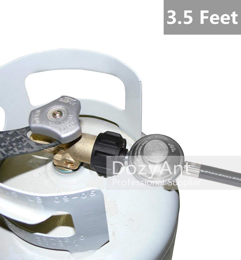 High Quality Material:100% solid brass can be effective corrosion protection. Ensure Your Safety:Our propane regulator with hose has excess flow protection for your safety and will automatically shut off. Convenient Installation: Installs quickly and easily tool-less attachment to propane tanks and cylinders. Apply to: Gas grills ,heaters, lanterns, camp stoves, tabletop grills, fire pit table and more. Great for: BBQ, camping, tailgating, heating needs or having an outdoor cookout. Product Specification: Type:Low pressure(Parallel) Inlet Pressure:25-250 PSI Outlet Pressure:11" W.C. Flow Capacity: 95000 BTU/Hour Certificate:CSA Length:3.5 feet /42 inch (length of rubber hose only) For your safety, please read before using the hose. Attention: 1.FULLY TIGHTENED at both propane tank side and grill side before using on your propane appliances. 2.Check and make sure the hose is away from the OPEN FIRE before installing it to your appliances. 3.Keep the hose away from HIGH TEMPERATURE.