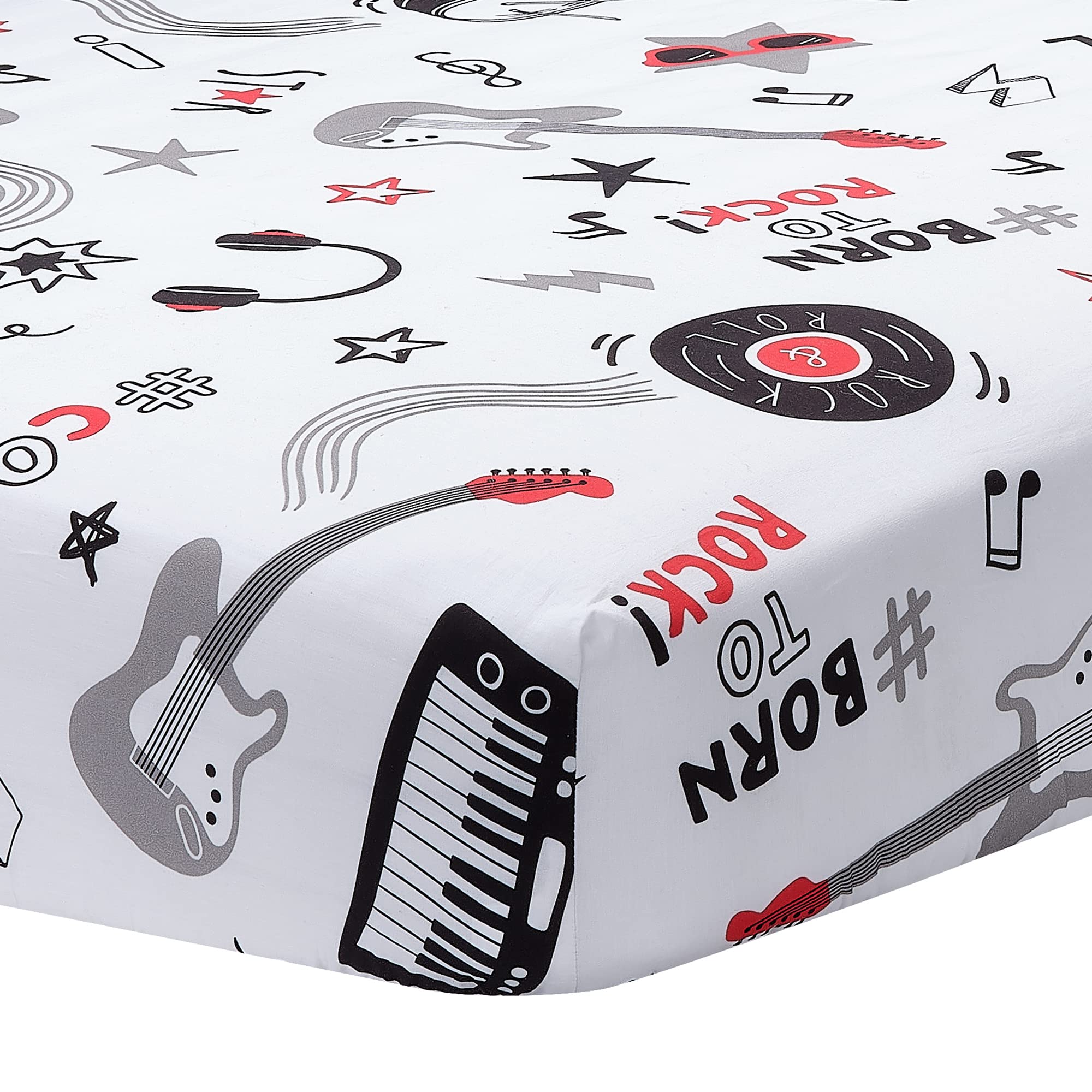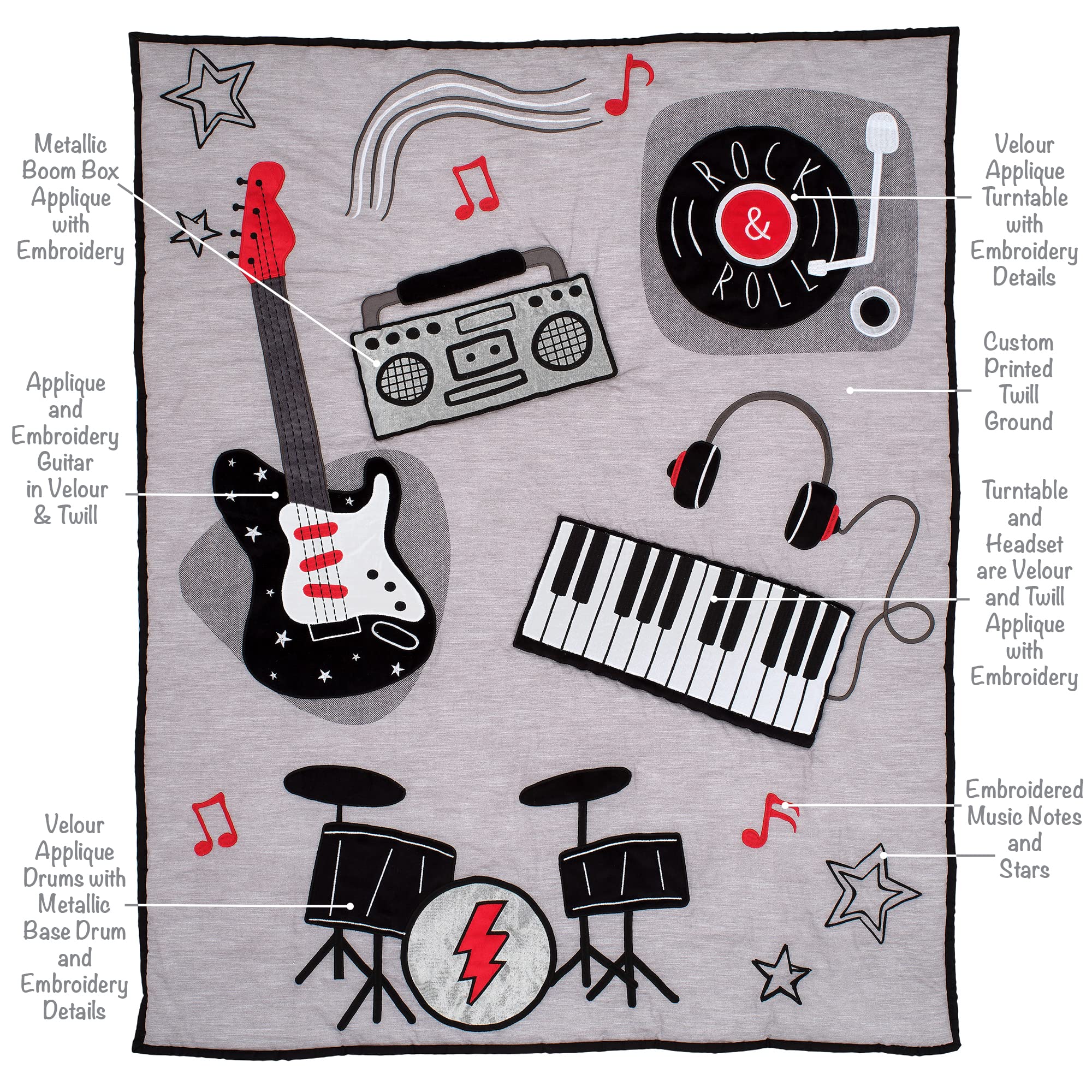 This three-piece nursery crib bedding set includes one quilt, one breathable 100% cotton fitted crib sheet, and one crib skirt. The luxurious quilt contains fully appliqued instruments including a velour guitar with black bean stitches and white embroidered stars, a silver metallic textured boombox, an expertly embroidered keyboard, and grandiose appliqued and embroidered drums. The breathable 100% cotton fitted crib sheet is on a white ground and includes musical notes, guitars, headphones, drums, boomboxes, and colorful stars. The fitted crib sheet has elastic all the way around ensuring a safe and secure fit on a standard sized crib mattress measuring 28β X 52β. The crib skirt adds the finishing touch to your childβs crib. It is a printed heather gray textured pattern, and the right corner is embroidered with the words Born to Rock along with two lightning bolts. It has a 14 Β½β drop.