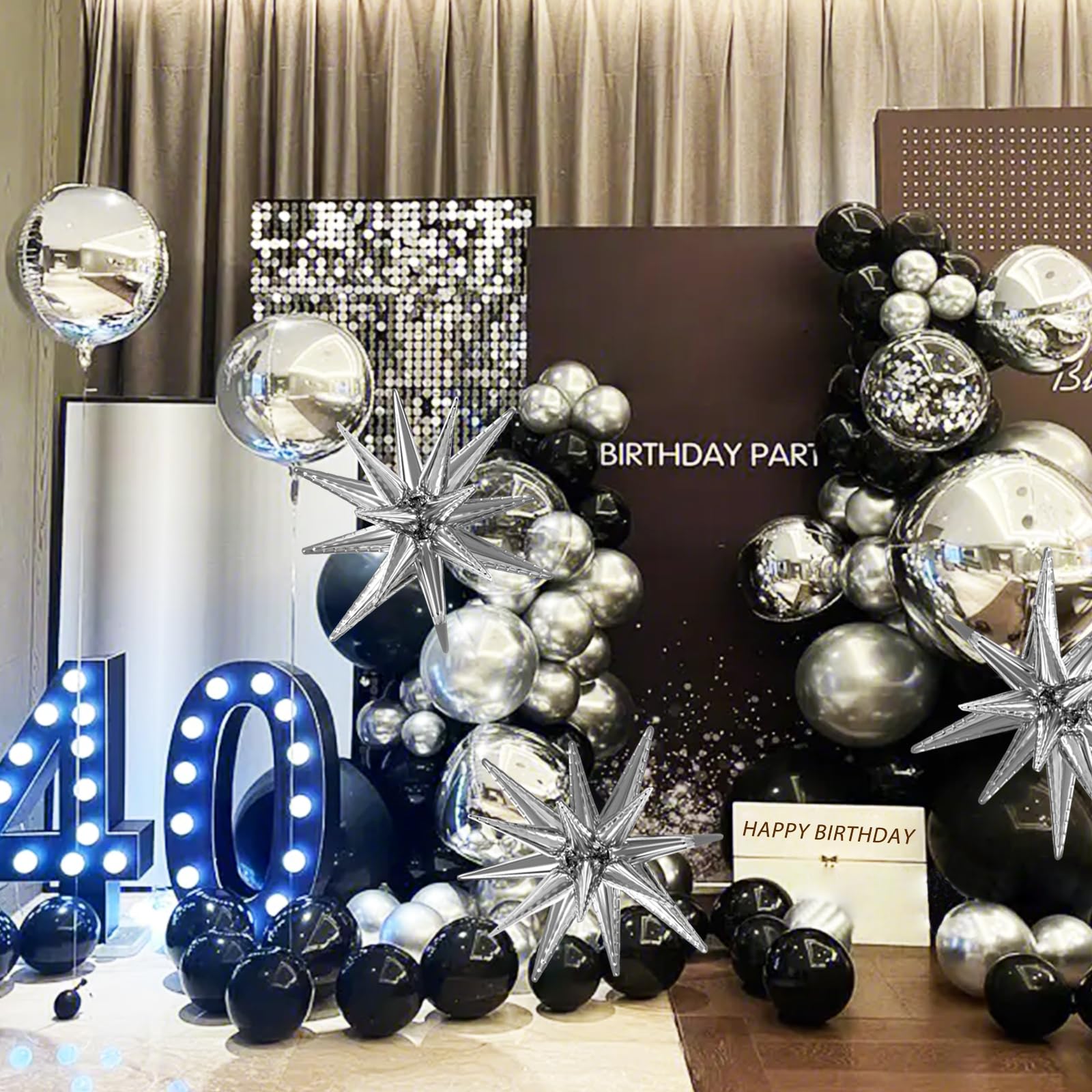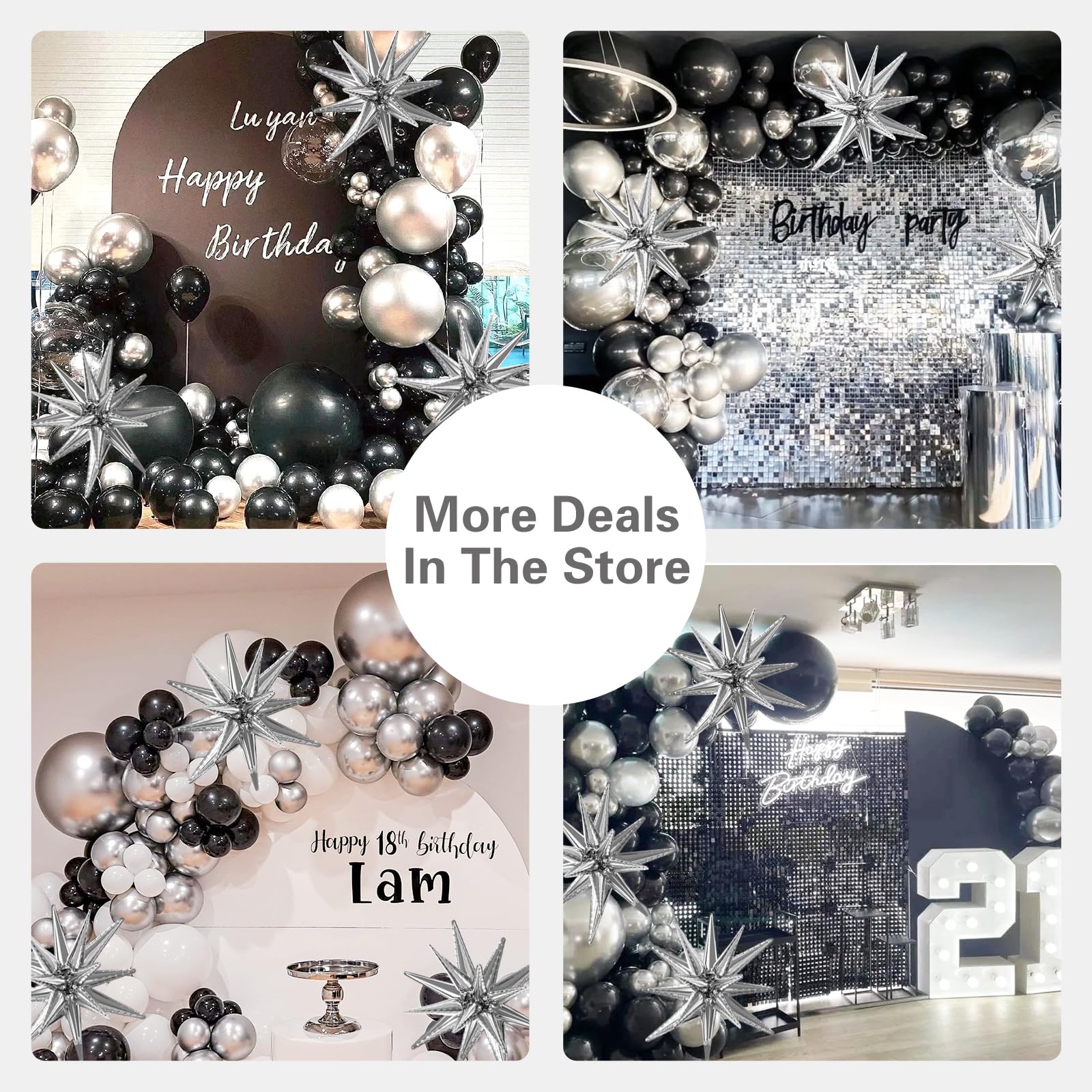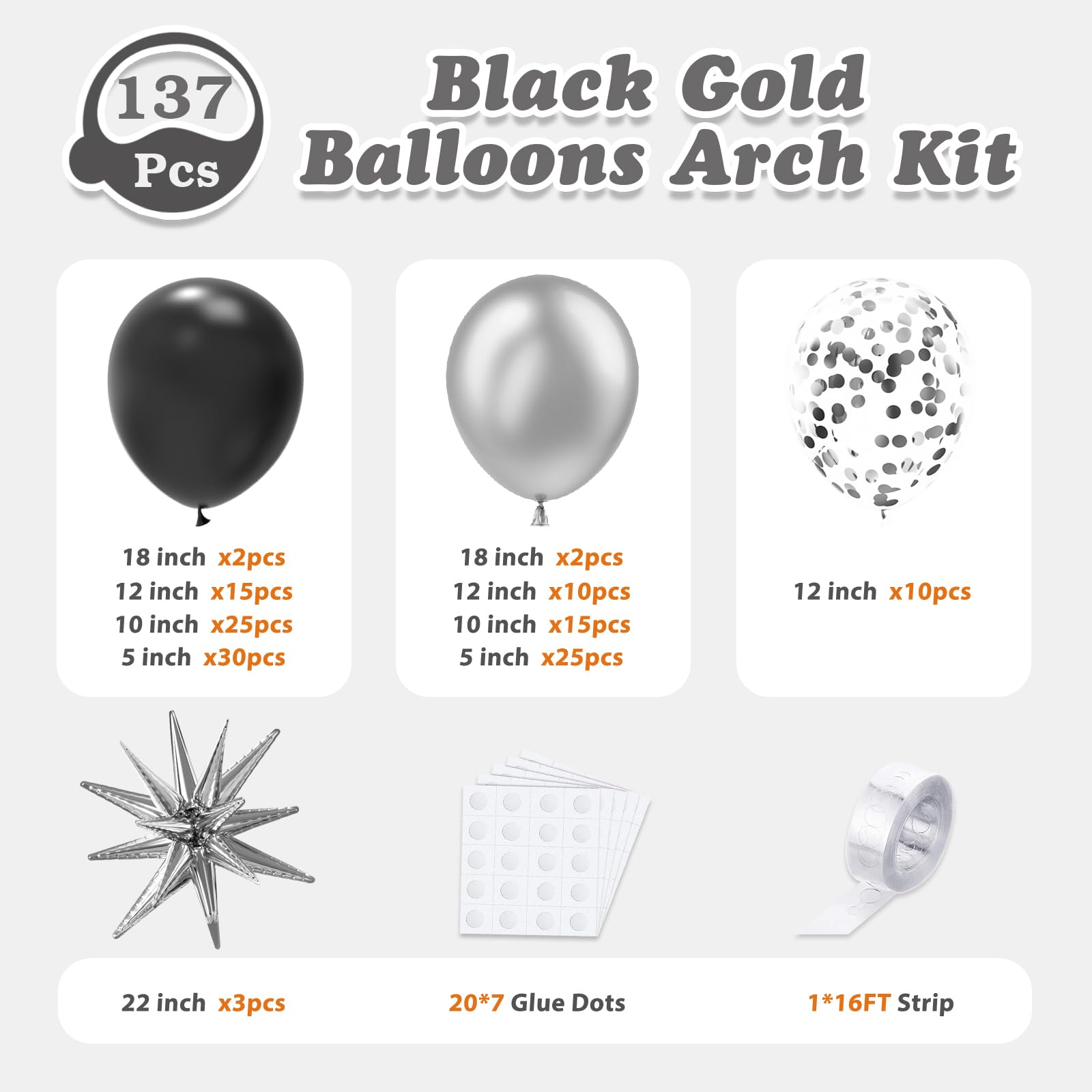 BLACK SILVER BALLOONS GARLAND WITH STARS: LOOLEY black and silver balloons garland kit total 137pcs latex balloons, silver stars balloons(22"*3pcs), metallic silver balloons (18"*2pcs, 12"*10pcs, 10"*15pcs, 5" *25pcs), matte black balloons (18"*2pcs, 12" *15pcs, 10" *25pcs, 5"*30pcs), black and silver confetti balloons(12" *10pcs).We are offer balloon garland strip*1,Dot glue 20*7PCS. Every memorable party starts with very shiny metallic balloons decoration!