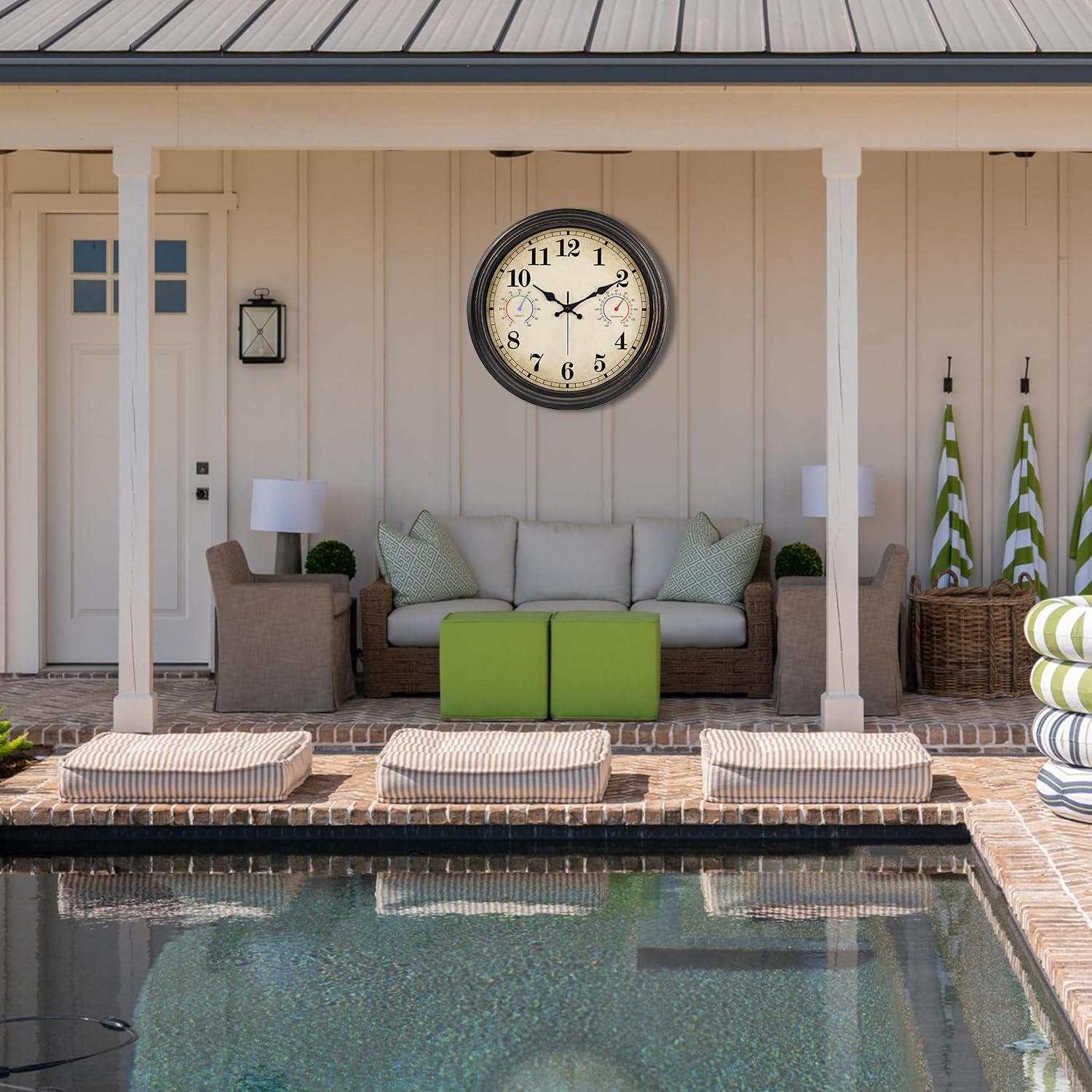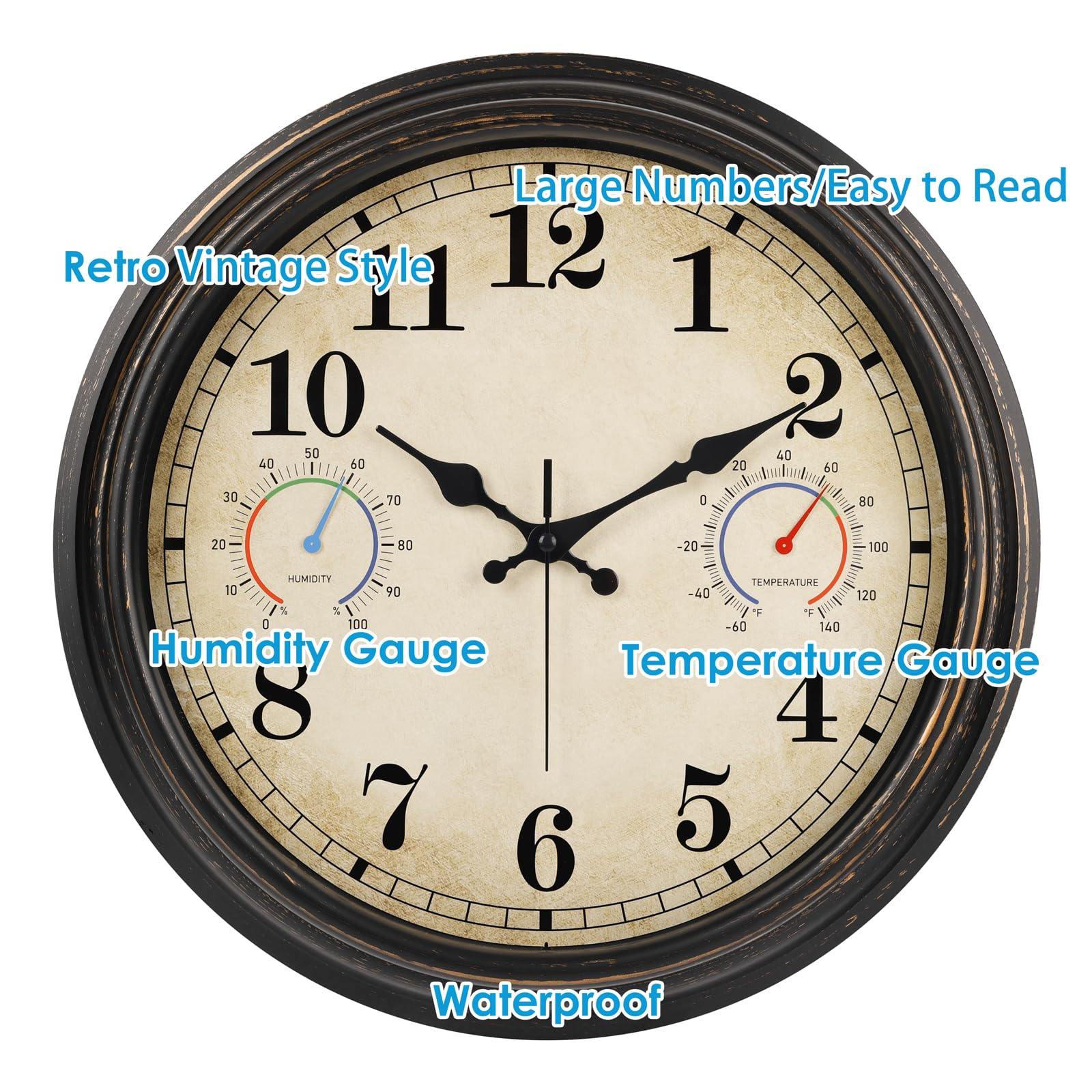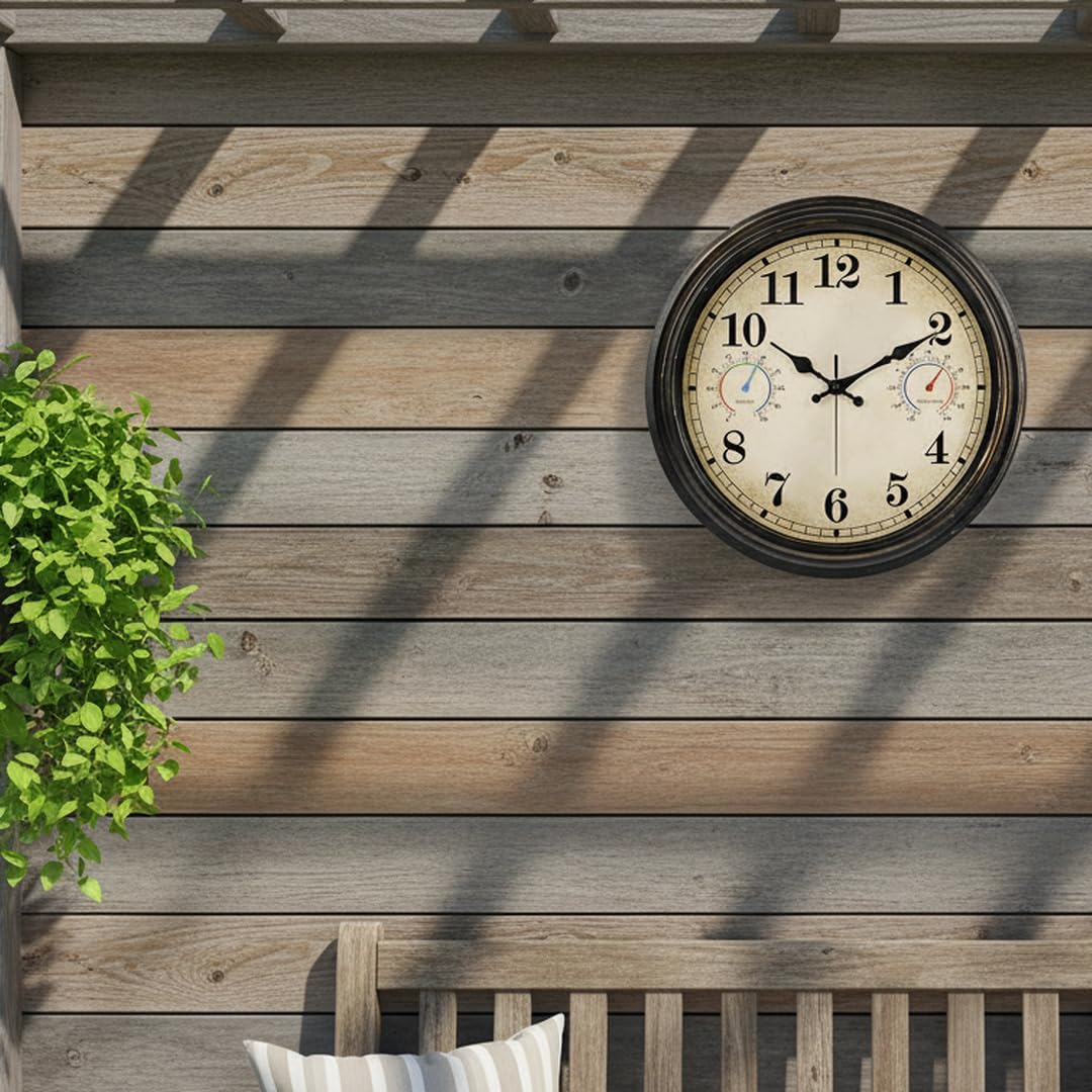 Retro-Style Bronze Outdoor Clock for Elegant Decor--With its classic bronze finish and vintage design, this 16-inch large Outdoor Clock doubles as a decorative piece. It’s perfect for enhancing the aesthetic of your patio, pool, garden,porch,yard,deck,garage,backyard,bathroom,living room,while providing accurate time and weather information.