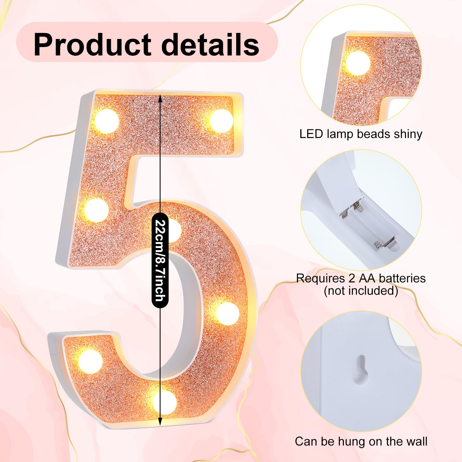 Easy Operation: the rose gold light up numbers are easy to operate. They have switches at their back for manual control, just need 2 AA batteries to be installed in the lights, but please pay attention to that batteries are not included. Besides, [5] and [0] light up number lights are designed with hooks in their back, which allow you to place them on the table or easily hung them on the wall