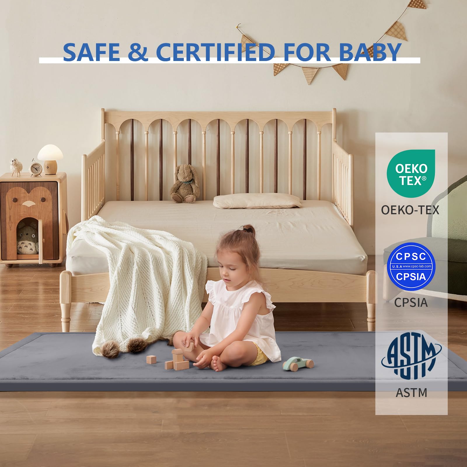 【Safe & Certified for Babies】Our baby play mat is designed with safety as the top priority. Certified by OEKO-TEX fabric standards and tested to meet CPSIA and ASTM requirements, this kids play mat is free from harmful substances. Parents can choose with confidence, knowing their little ones are playing on a non-toxic, ultra-soft crawling mat.