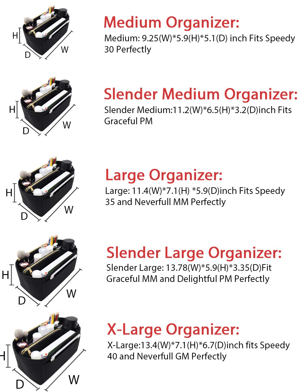 SIZE OF BAG ORGANIZER: Medium: 9.25(L)*5.9(H)*5.1(W) inch Fits Speedy 30 Perfectly. Slender Medium: 11.2(L)*6.5(H)*3.2(W)inch Fits Graceful PM. Large: 11.4(L)*7.1(H) *5.9(W)inch Fits Speedy 35 and Neverfull MM Perfectly. Slender Large: 13.78(L)*5.9(H)*3.35(W)Fit Graceful MM and Delightful PM Perfectly. X-Large:13.4(L)*7.1(H)*6.7(W)inch fits Speedy 40 and Neverfull GM Perfectly. Portable and Compact Purse Perfectly For any Brand.L*H*W means (Length*Height*Width)