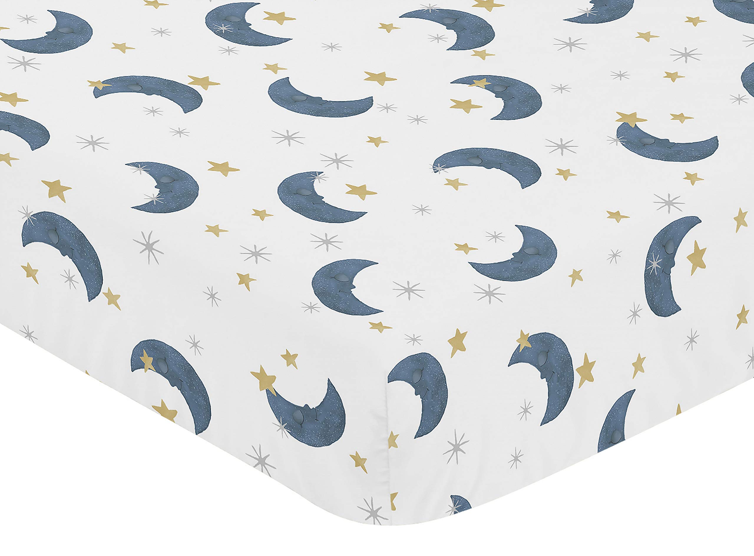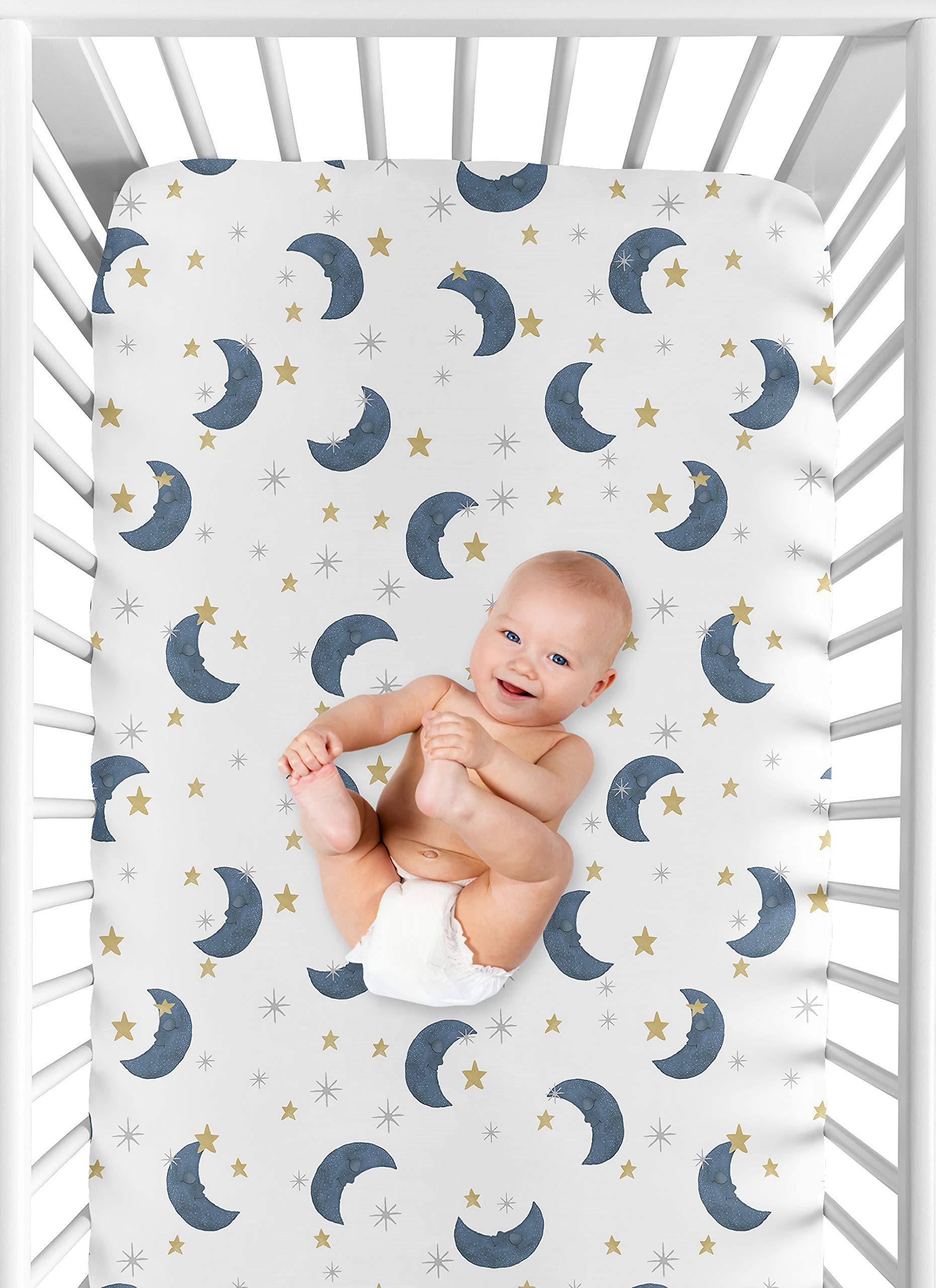 SNUG FIT: Includes (1) Fitted Crib Sheet 52in. x 28in. x 8in. Our newborn standard crib sheets fit snugly, with premium elastic sewn around the entire bottom edge for a secure fit on most standard sized cribs & toddler beds, to reduce shifting & bunching. This brushed microfiber crib sheet features an exclusive design of a navy blue, gold, silver, grey and white watercolor, celestial, modern, classic, stars, moons bear print & is gentle on delicate skin to foster a soothing sleep environment.