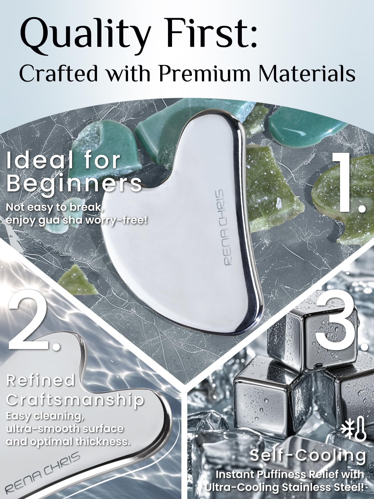 BEST FOR BEGINNERS: Rena Chris metal gua sha tools are crafted from 100% premium stainless steel. Their durability and self-cooling properties make them ideal for all skin types, offering a seamless introduction to gua sha