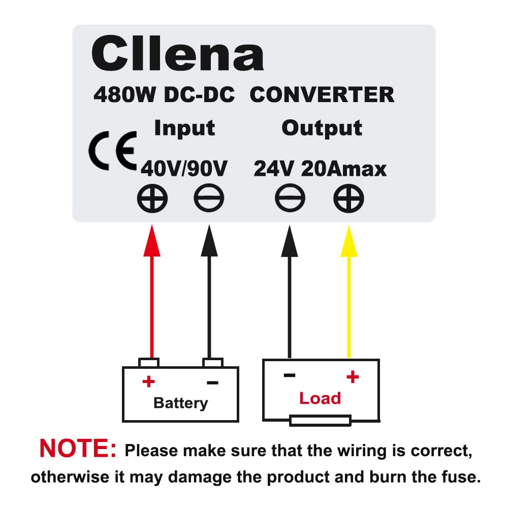 Input voltage range: DC 40V-90V; Output voltage: DC 24V(non-adjustable); Output current: 20A; Output power 480W.