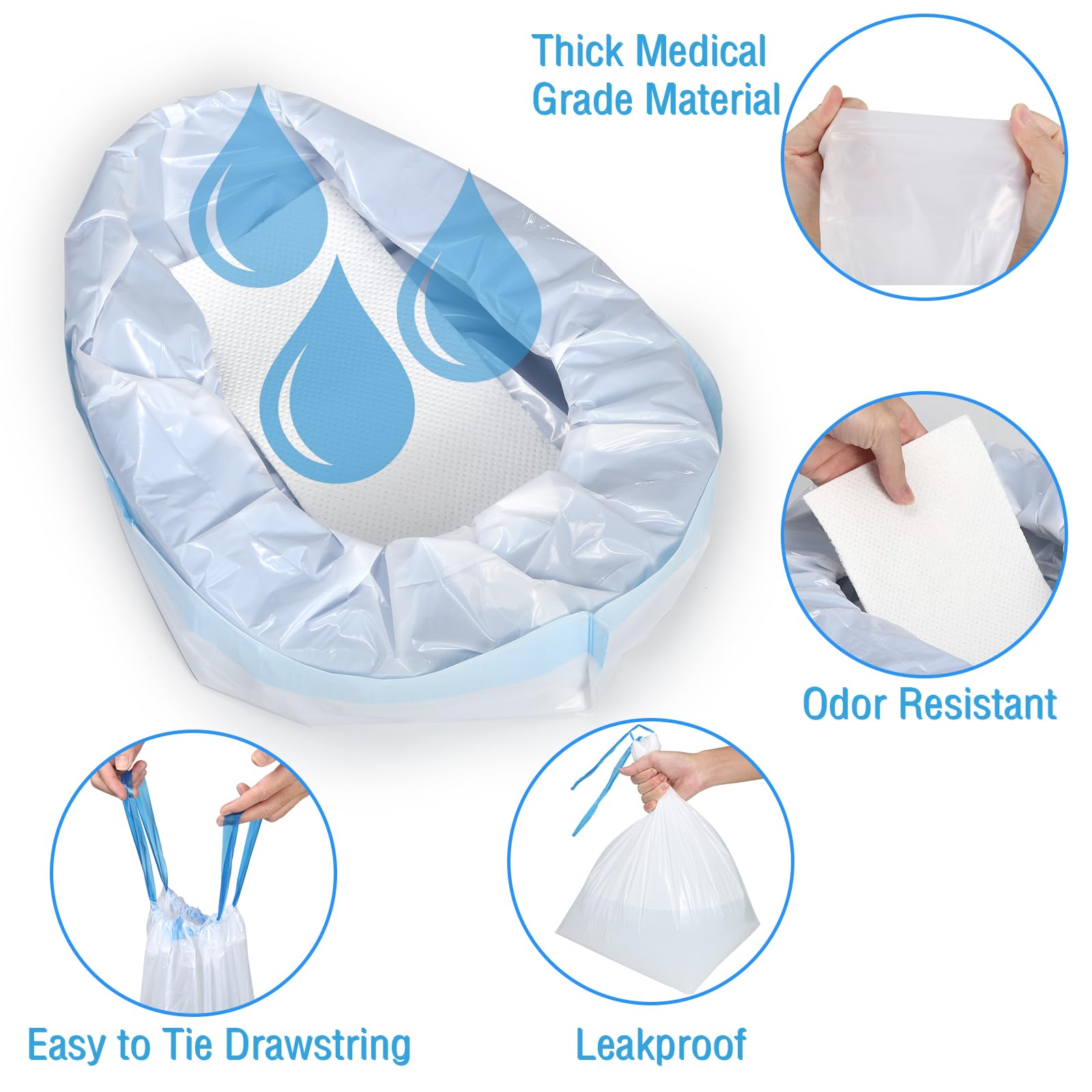 【Easy to Use And Mess-free Cleanup 】-Say goodby to hassle of hand cleaning of bedpans with the disposable commode liners and super absorbent pads. Just remove the bedside commode liners with the absorbent pad by pulling on the strings, then tie up the potty bag to reduce odors.