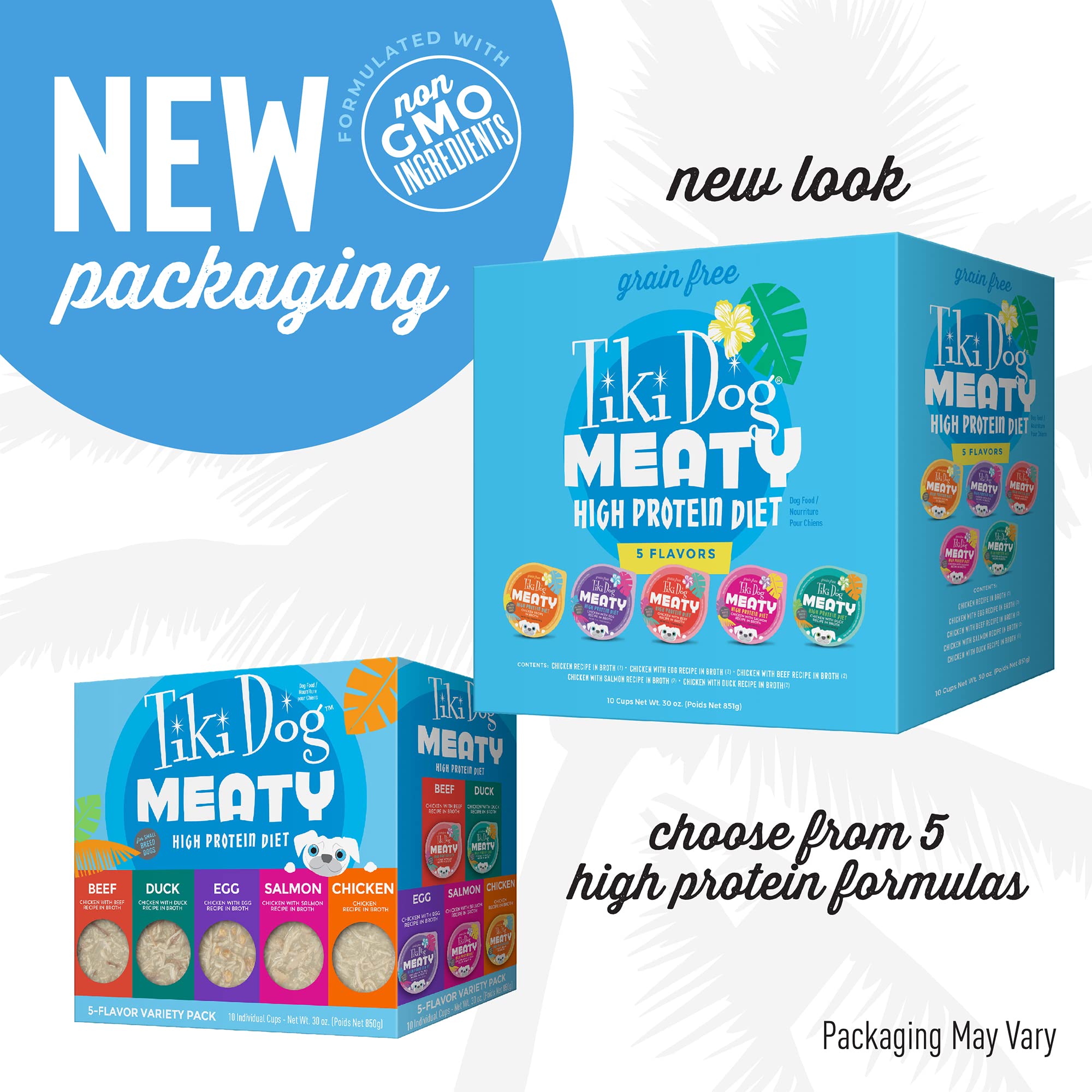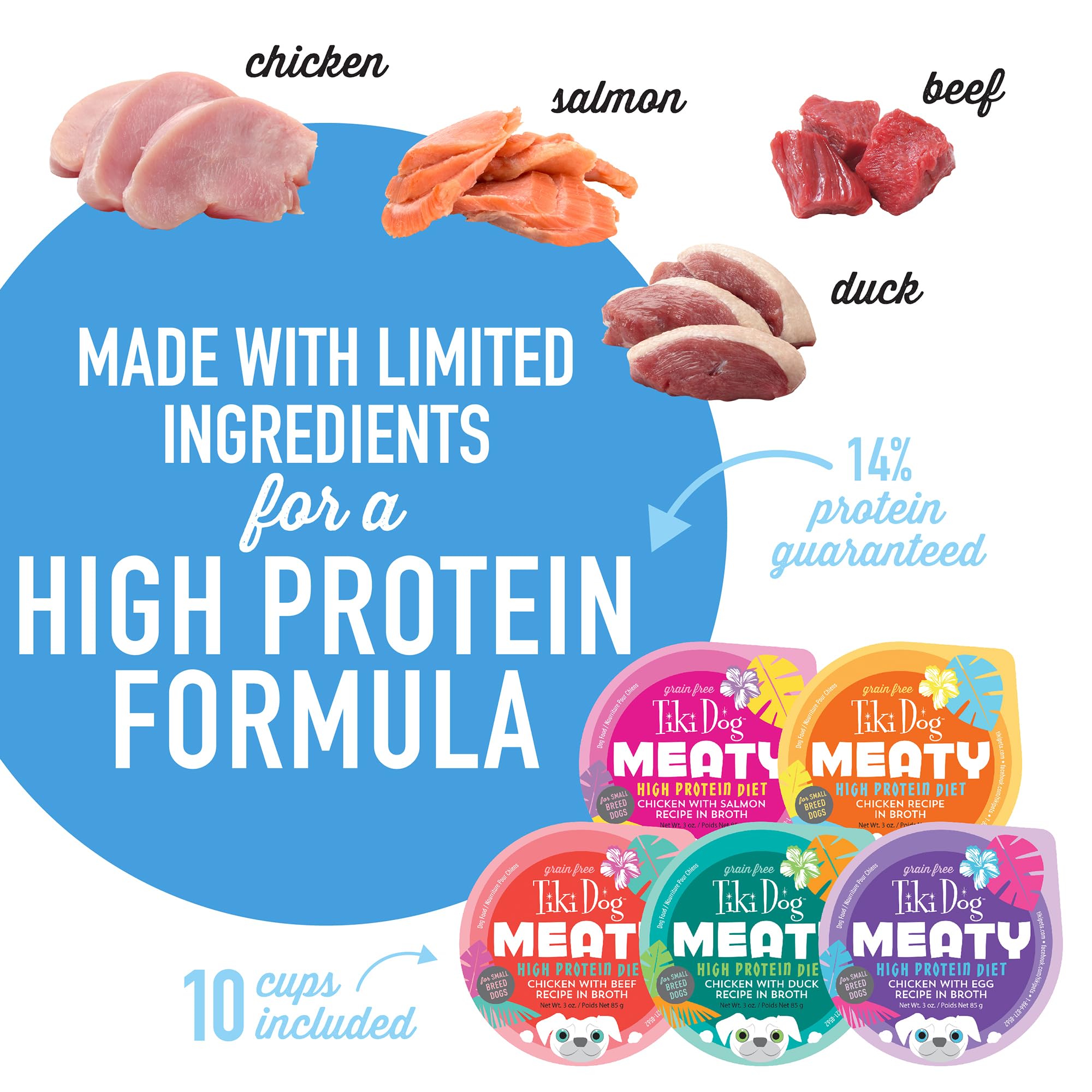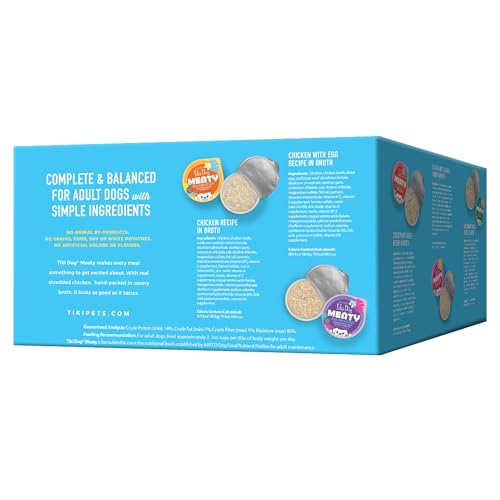 Tiki Dog Meaty Recipes in Broth canned dog food focuses on protein. You won't find any grain or added carbohydrates in these shredded meat cups. This grain free wet dog food contains shredded meat recipes that are packed in a natural broth for additional moisture and flavor. Feed your best friend delicious meat. Without added grains, gluten, fillers or artificial colors, each 3-ounce cup also contains fish oil and turmeric, making it the best dog food for your pup. Each delicious bite of this dog food is brimming with the begging-for-more flavor they want Try out our small dog food now for a delicious and healthy treat your pup will love. See the difference that Tiki Dog makes, and give your dog the nutrition he needs and the flavor he craves.
