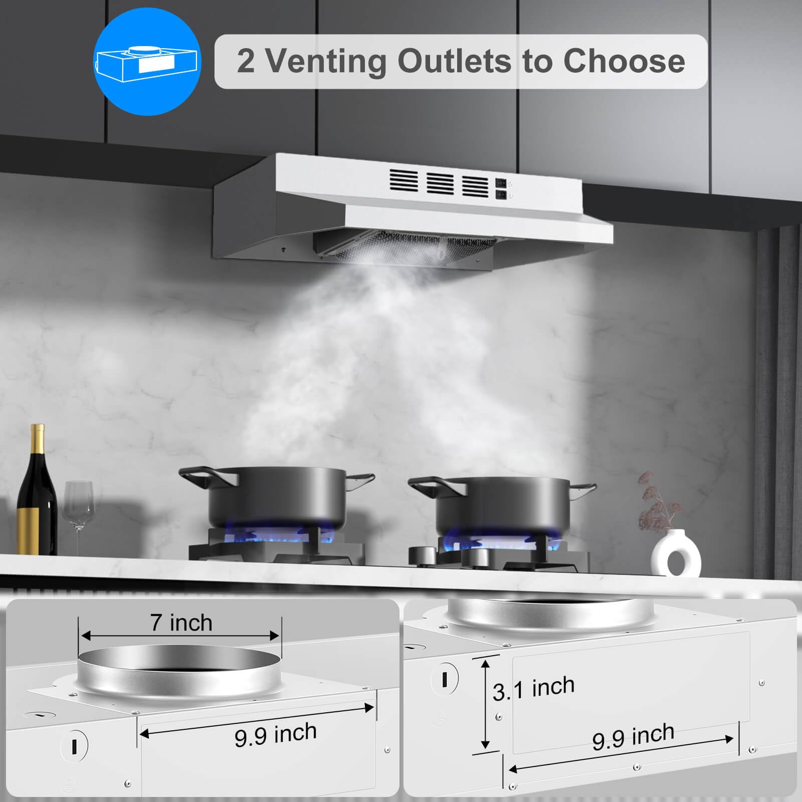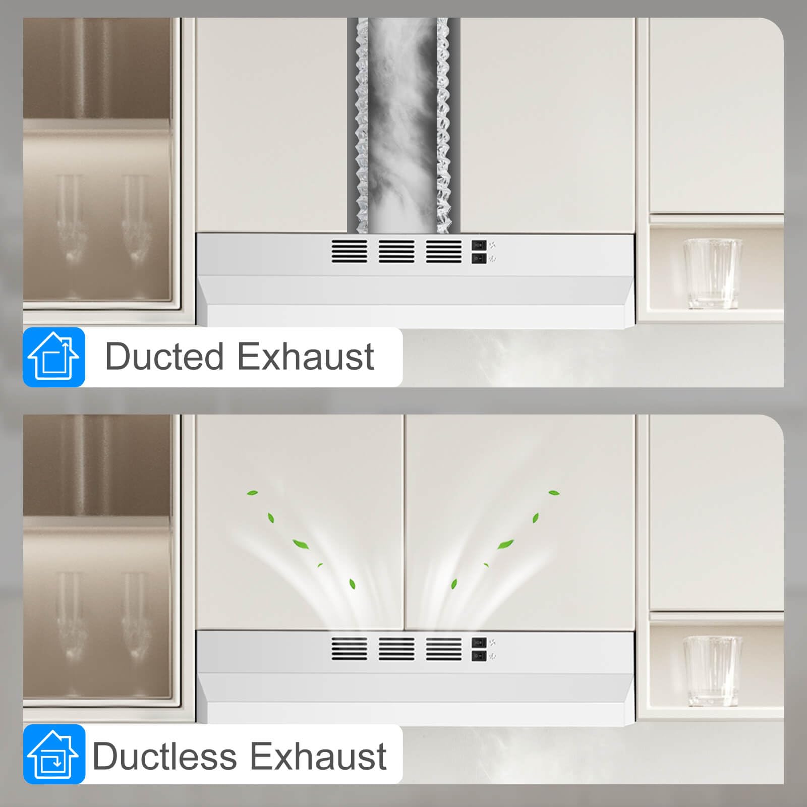 【Ductless Range Hood Convertible Ducted】2 venting outlets,7" round top vent and 9.9"x3.1" rectangular rear vent,fixed under cabinet or against the wall are both available.Default is ventless range hood with carbon filter(Part #CF-3976),suggested to change this part every 3-6 months according to your kitchen conditions