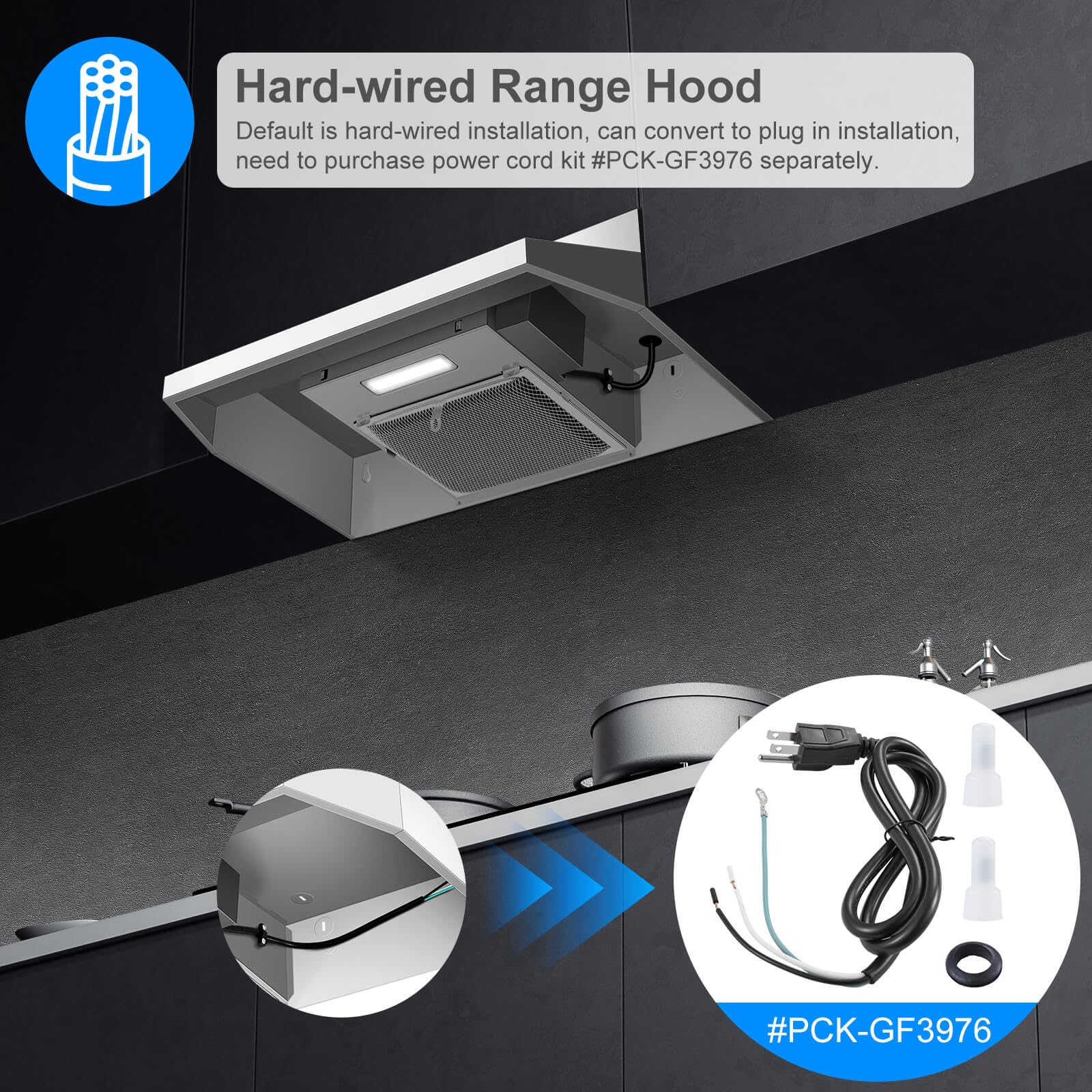 【Default is Hard Wired Mounted】Factory set as a hard wiring kitchen range hood(without plug),can convert it to plug in easily just purchase a part # PCK-GF3976. 2 options of power supply support,giving you more flexible and convenient installation.Voltage/Frequency:110-120V/60Hz,Input Power:52w