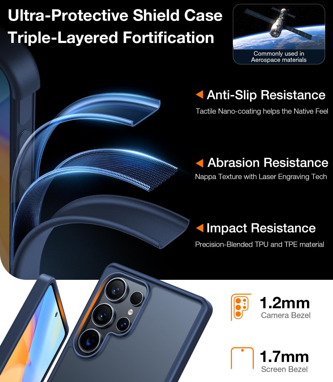 [Slim Style, Premium Grip] Graced with a Nano-Oleophobic and hydrophobic coating, ultra thin s25 ultra case wards off smudges and scratches with ease. Unlike ordinary cases made from cheap plastic, our three-layer coating design effortlessly achieves anti-stain, anti-fingerprint, and scratch-resistant properties. The exquisite texture on the sides enhances grip comfort, letting you say goodbye to slippery or bulky handling. Embrace elegance in every use.
