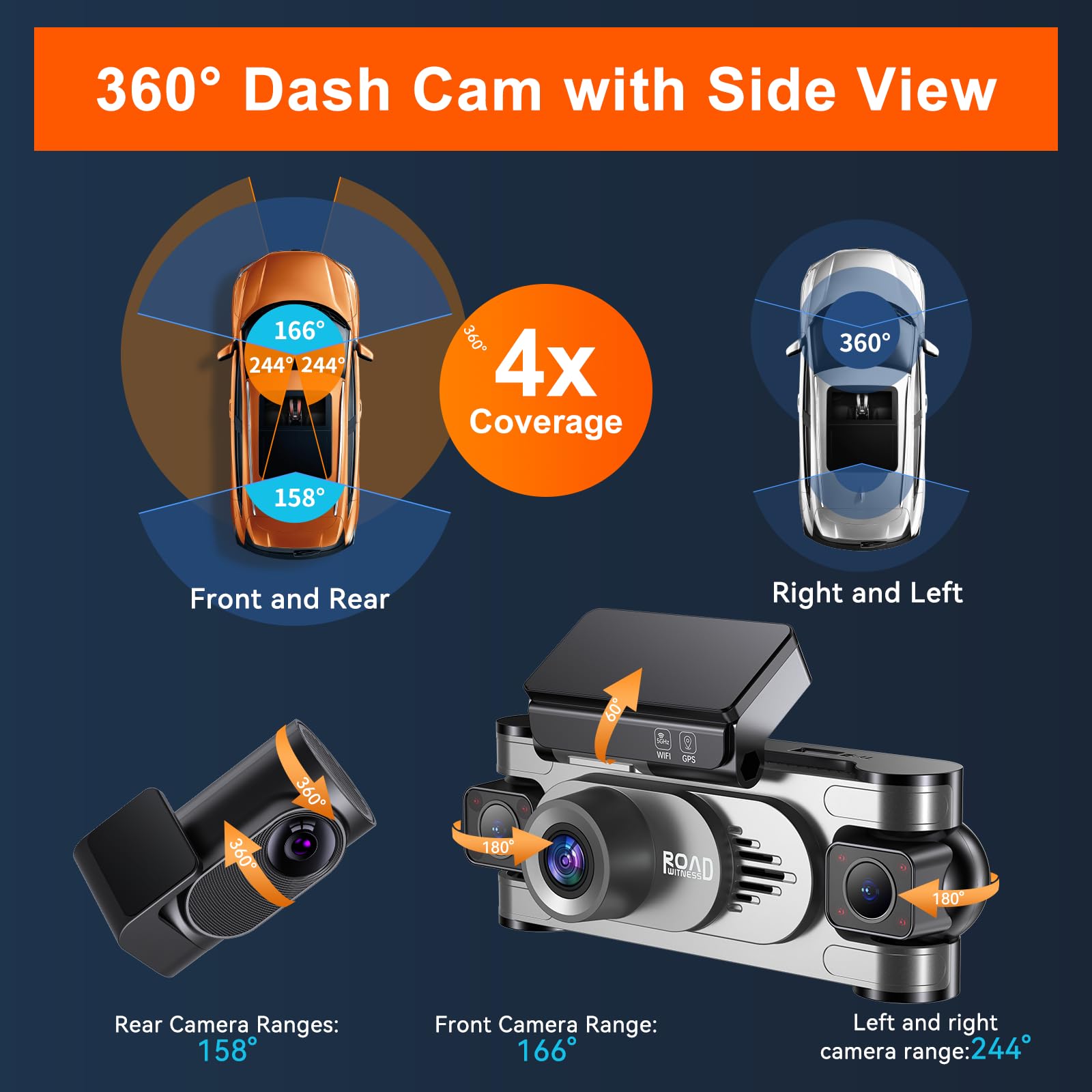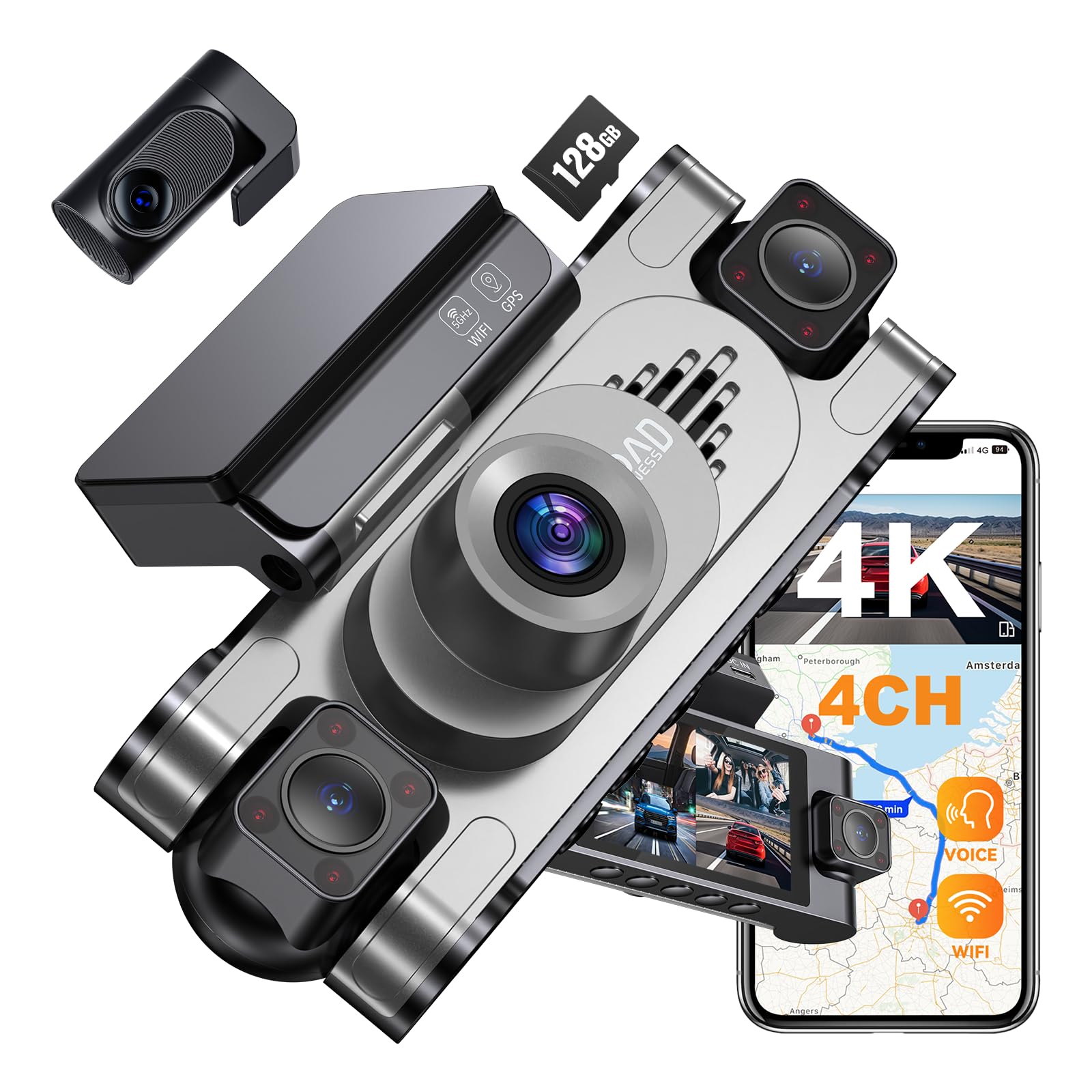 【4-Channel 360° Dashboard Cam】The dashcam integrates a 166° front lens, 158° rotatable rear cam, and dual adjustable side cams to monitor road front/rear, cabin, and flanks simultaneously. 4K UHD resolution ensures blind-spot-free 360° coverage, capturing license plates and road details. Quad-layer collision protection and 4-channel recording secure driving/parking