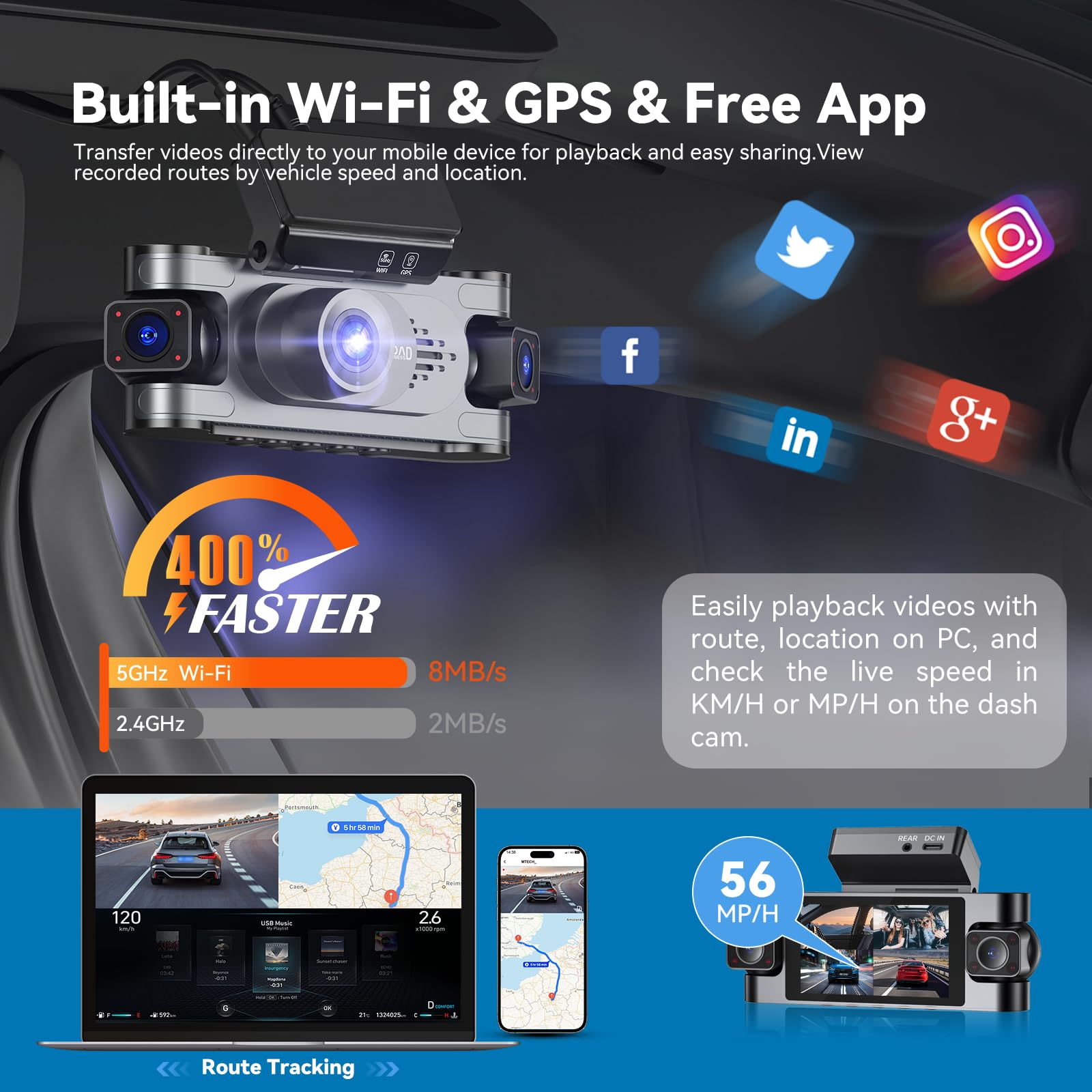 【5G WiFi /2.4GHz& GPS】Equipped with an integrated 5GHz WiFi &2.4GHz Dual module and GPS, this 4-channel dashcam delivers 4x faster data transfer speeds and enhanced positioning accuracy. Streamline operations via the free app: preview/edit/share footage in real time, track real-time location/speed (KM/H or MPH), and monitor travel routes. Generate mileage reports instantly for legal evidence following traffic incidents.