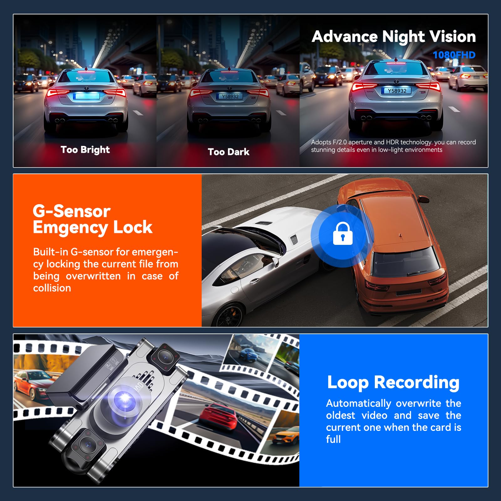 【Loop recording&G-Sensor : Road Witness for Accidents】Loop recording automatically overwrites the oldest files when storage is full. The adjustable-sensitivity G-sensor detects collisions and emergency-locks footage to the event folder, preventing critical evidence from being overwritten.