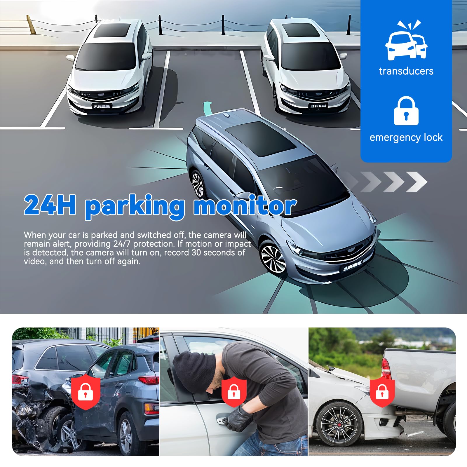 【24-Hour Parking Mode】When connected via hardwiring kit (sold separately:ASIN:B0DZNPYJC8), the dashcam activates low-FPS time-lapse recording after engine shutdown. It monitors surroundings continuously, triggering full-resolution recording upon detecting motion/collisions near your parked vehicle. This energy-efficient mode preserves critical evidence for vandalism/theft incidents while optimizing storage space via 1fps time-lapse capture—ideal for extended parking periods.