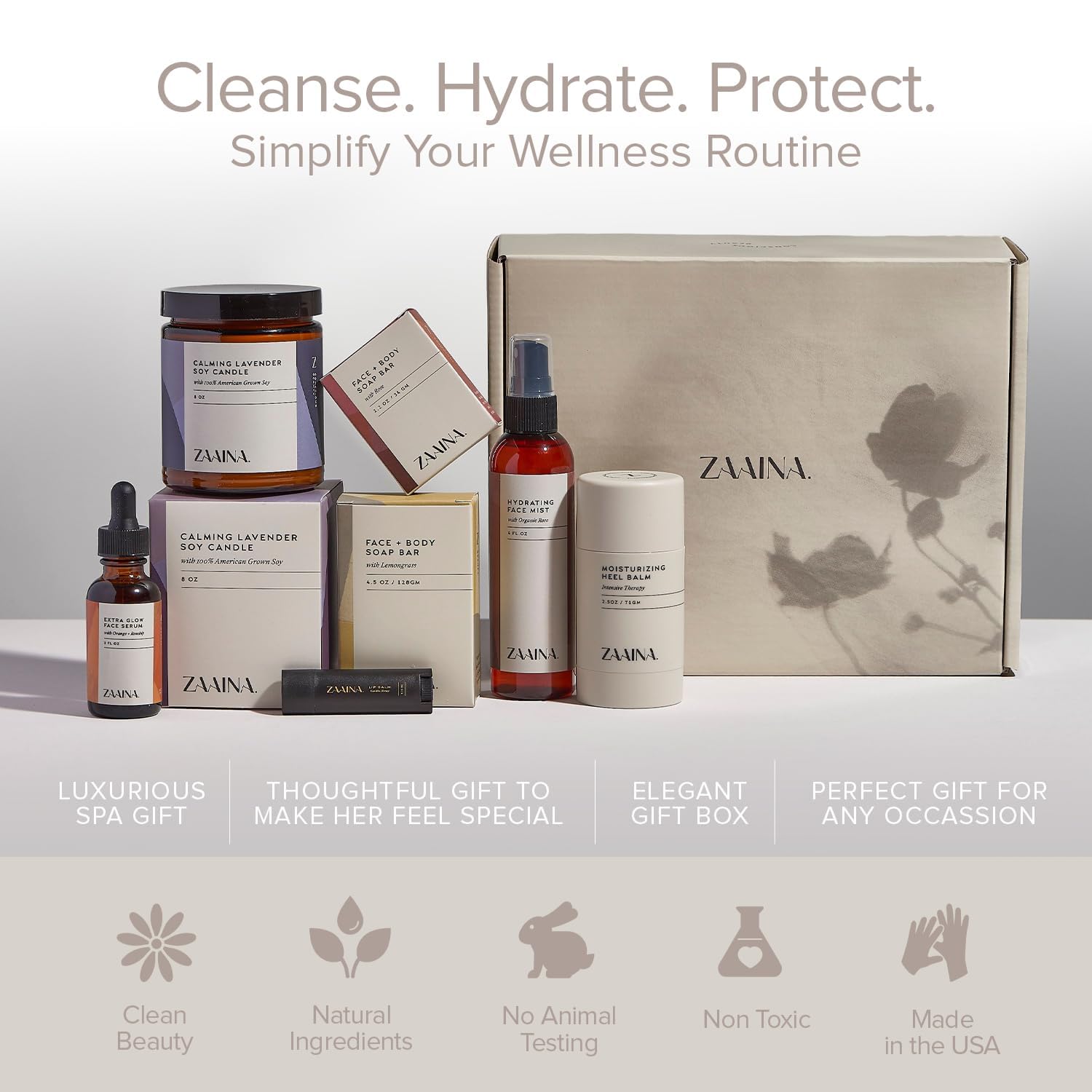 LUXURIOUS SPA KIT FOR WOMEN GIFT SET: Indulge in the ultimate spa gift for women with this carefully curated spa day kit. Featuring a lavender soy candle, lemongrass lavender handmade soap, rose face mist, extra glow face serum, moisturizing heel balm, travel-size rose soap bar, and vanilla honey lip balm. This beauty gift set is ideal for those who enjoy a pampering gift for women. All items are crafted to provide a relaxing spa experience.