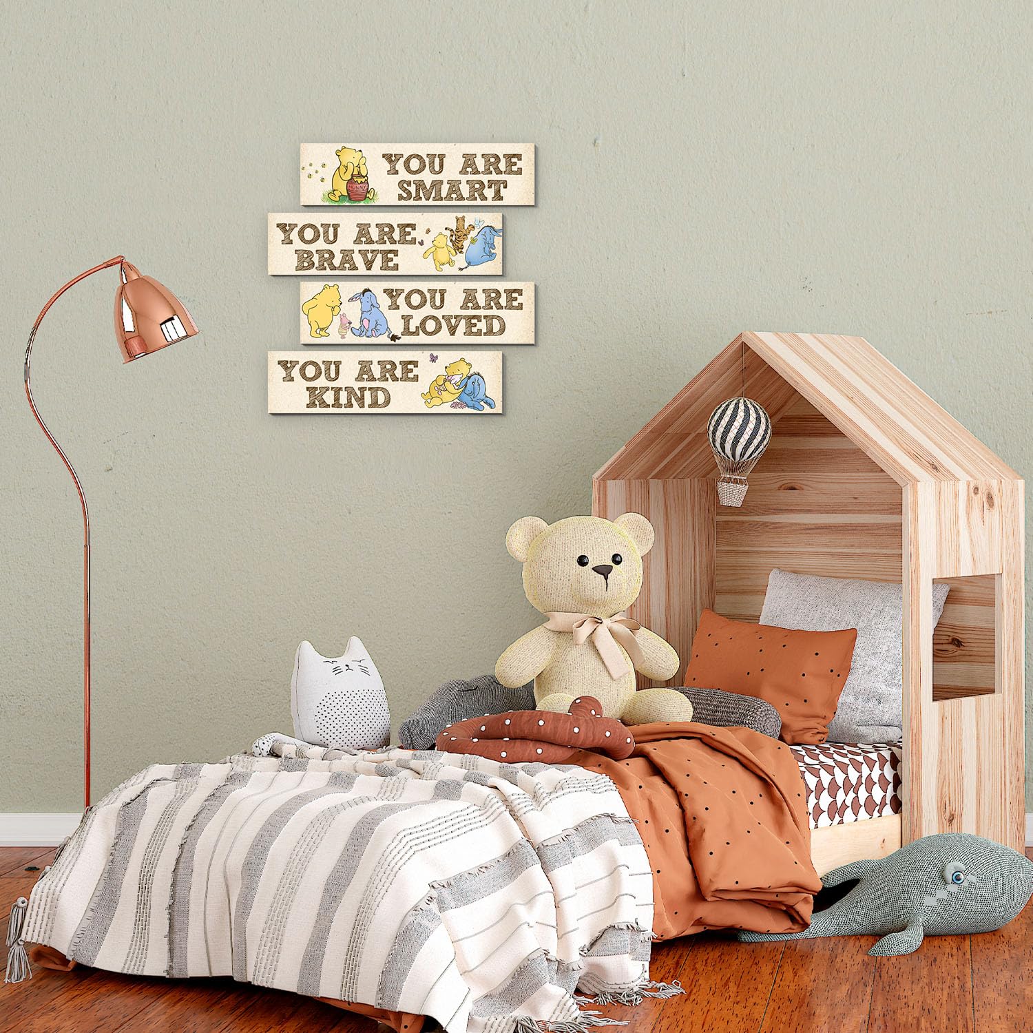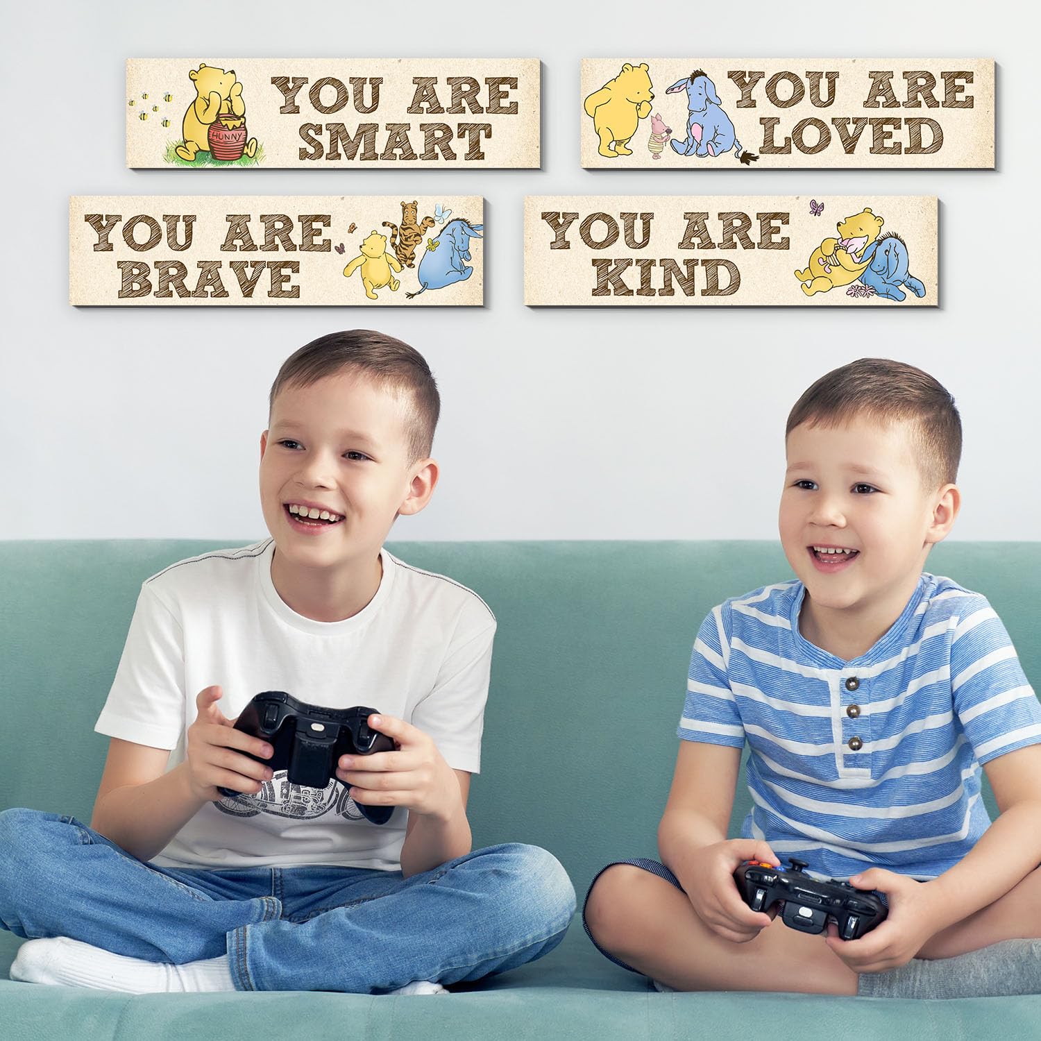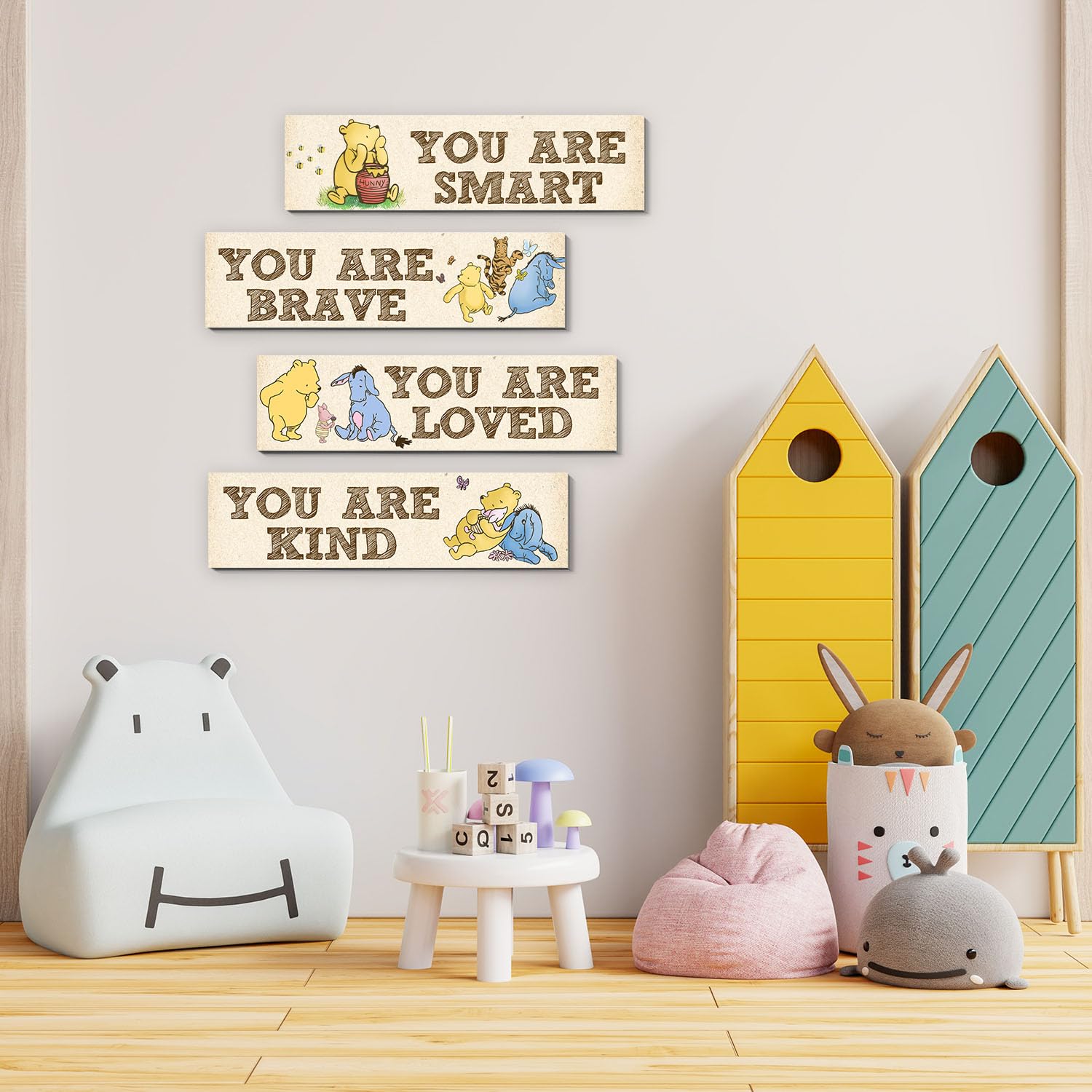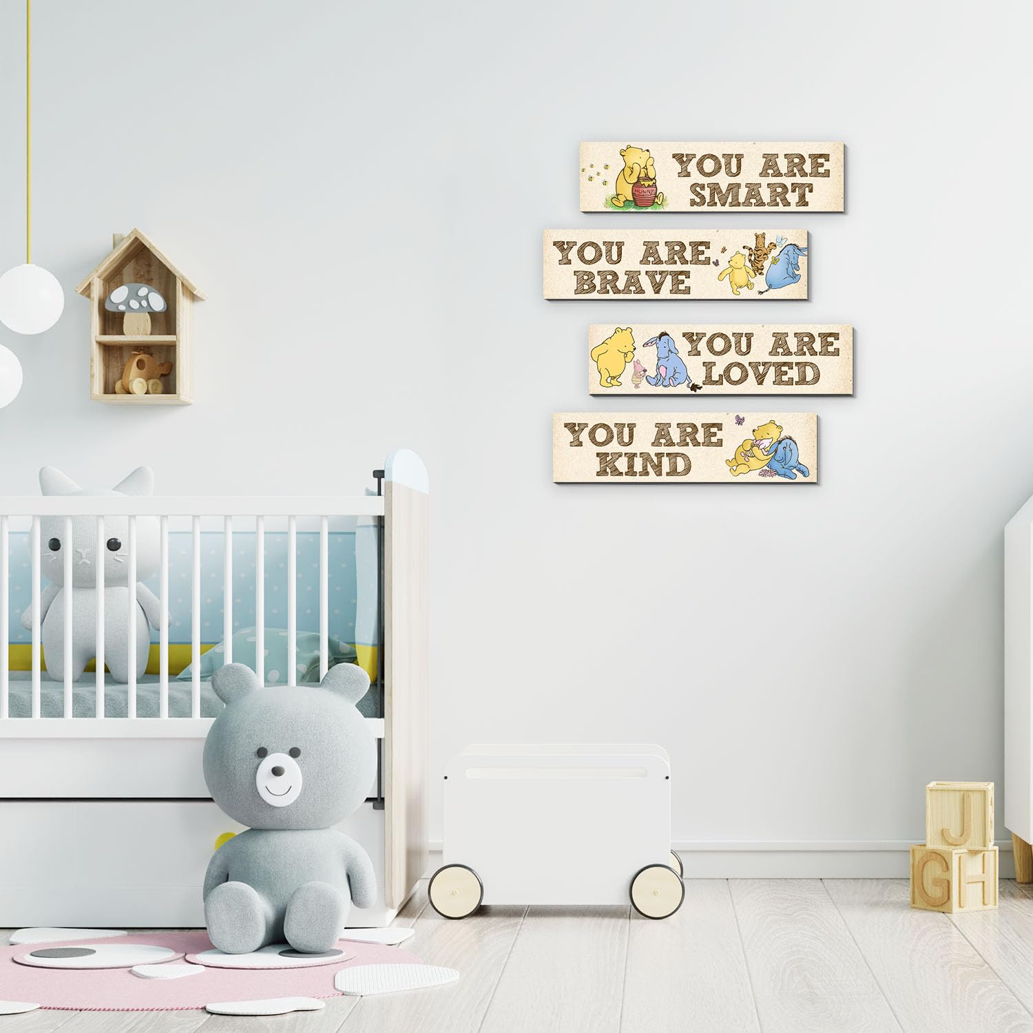 4 Piece Set for Comprehensive Decor: this package includes 4 winnie theme sign, each featuring a design; The set allows for various decorating possibilities, either as individual pieces or a collective display, providing a full, comprehensive decoration experience; The equipped hooks at the back make the installation easy, transforming the children's room into their Winnie universe in just a few minutes