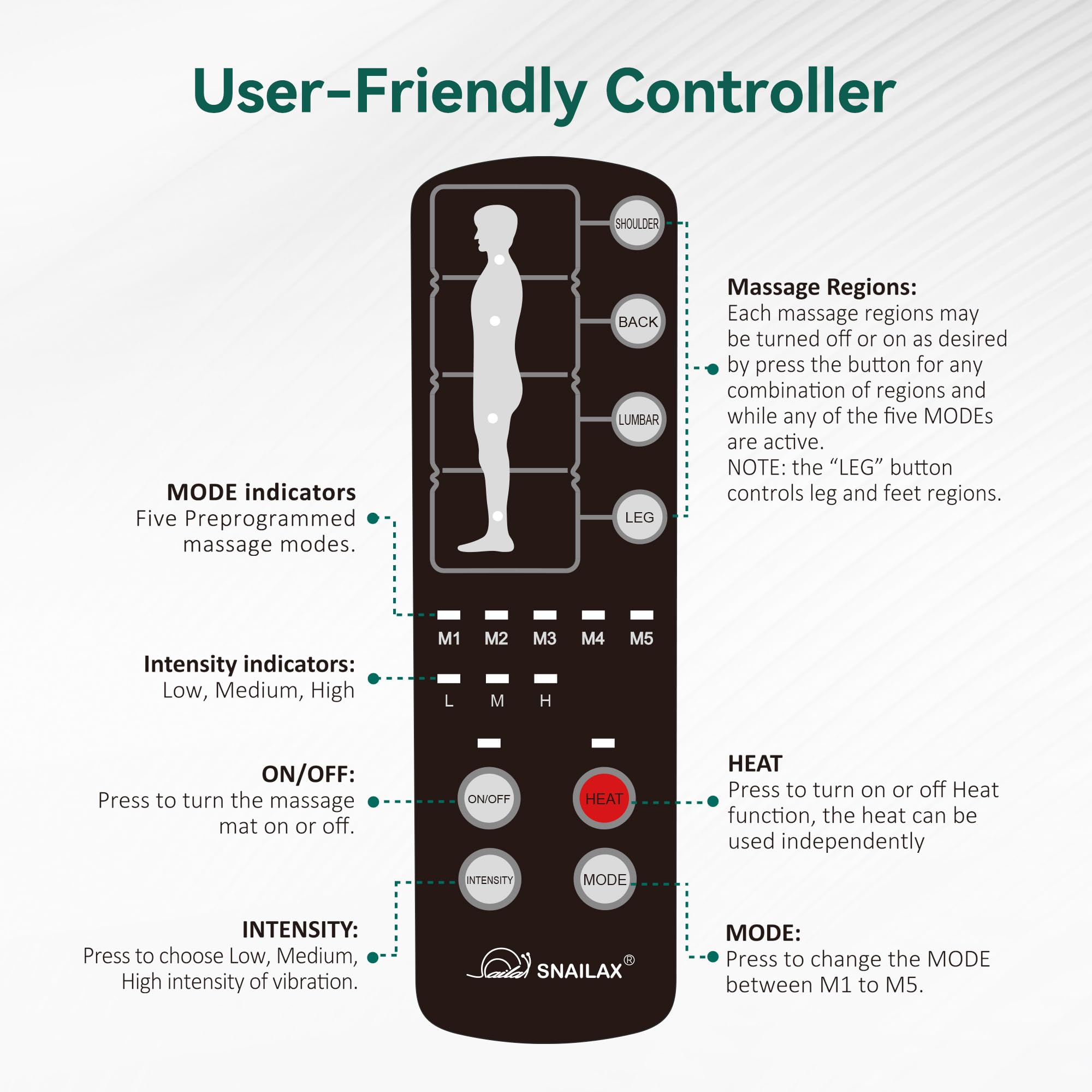 Customizeable Massage-The back massager Mat with heat allows you choose the Shoulder,back,Lumbar, Leg massage area, or combine all these areas together, all inclusive 5 program modes and 3 variable vibration intensity levels for you come to customizeable personal massage needs.