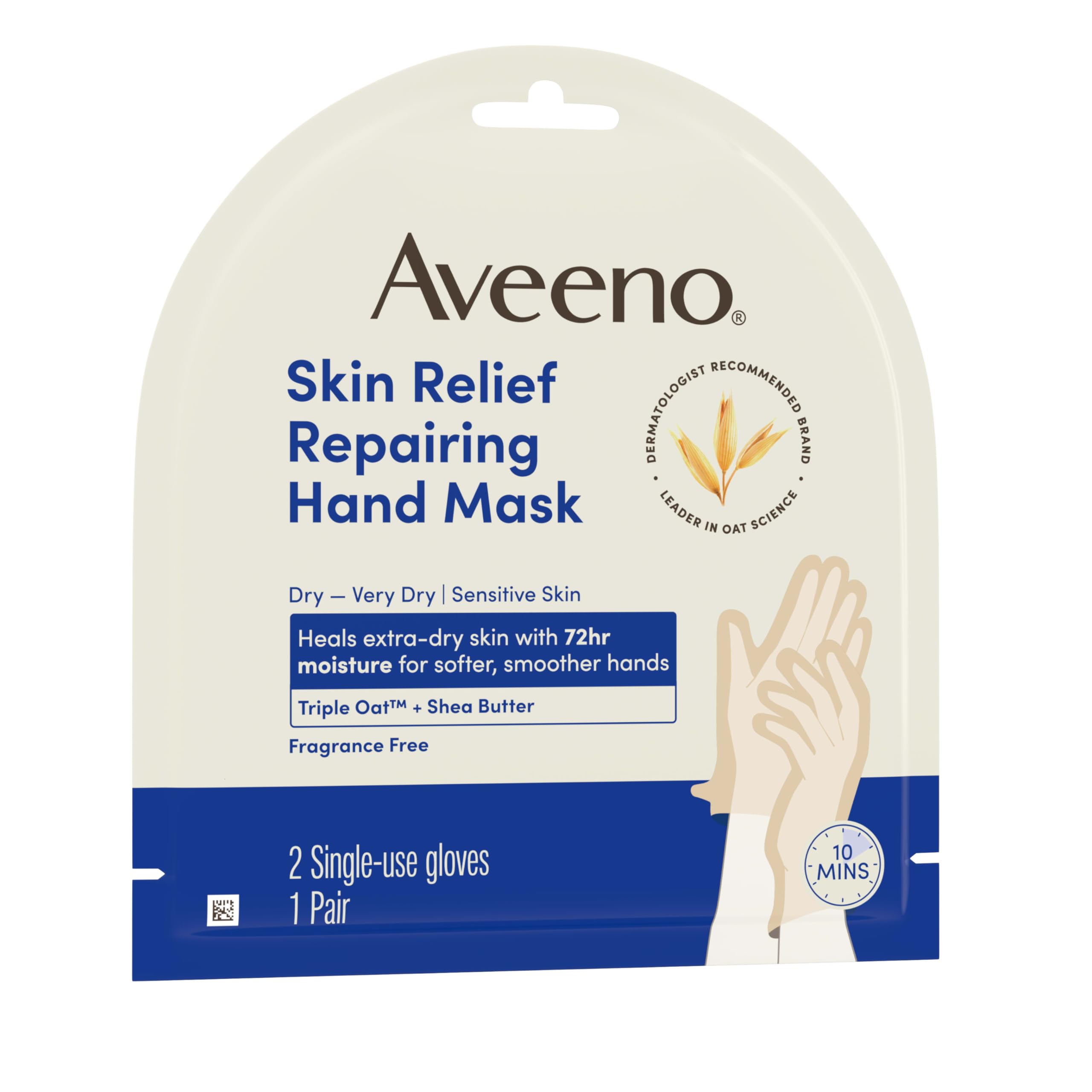Help heal very dry skin on your hands with Aveeno Skin Relief Repairing Hand Masks. These single use, no drip moisturizing gloves are enriched with Triple Oat and Shea Butter. Our Triple Oat blends oat flour, oat extract and oat oil to relieve itch due to dryness Clinically proven to repair very dry skin with 72-hour moisture for softer, smoother hands. The hand mask spa gloves go beyond the moisture barrier to soothe dry skin from within the surface layers for moisturized and healthy-looking hands. The non-comedogenic gloves for hand care wonβt clog pores and they are easy to use. Simply wash & dry your hands, wear the gloves for approximately 10 minutes, & remove, no need to rinse. The non-greasy hand care masks are formulated for dry, sensitive skin & are free from fragrance, parabens & dyes. Give your dry hands some much needed relief with these moisturizing hand masks from Aveeno, a dermatologist recommended brand for over 70 years.