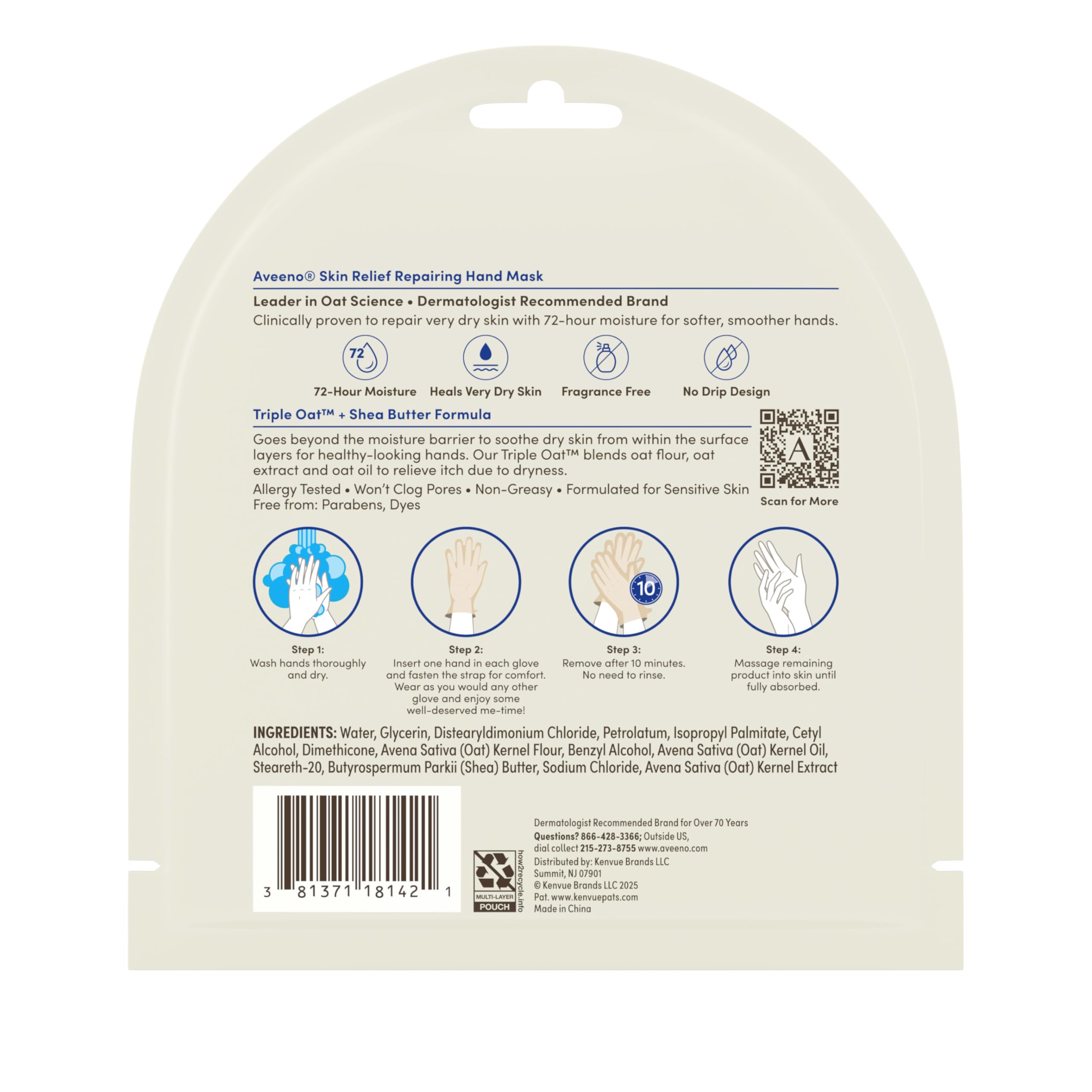 Pack of one pair of single use Aveeno Skin Relief Repairing Hand Masks formulated with triple oat and shea butter are clinically proven to repair very dry skin with 72-hour moisture for softer, smoother hands