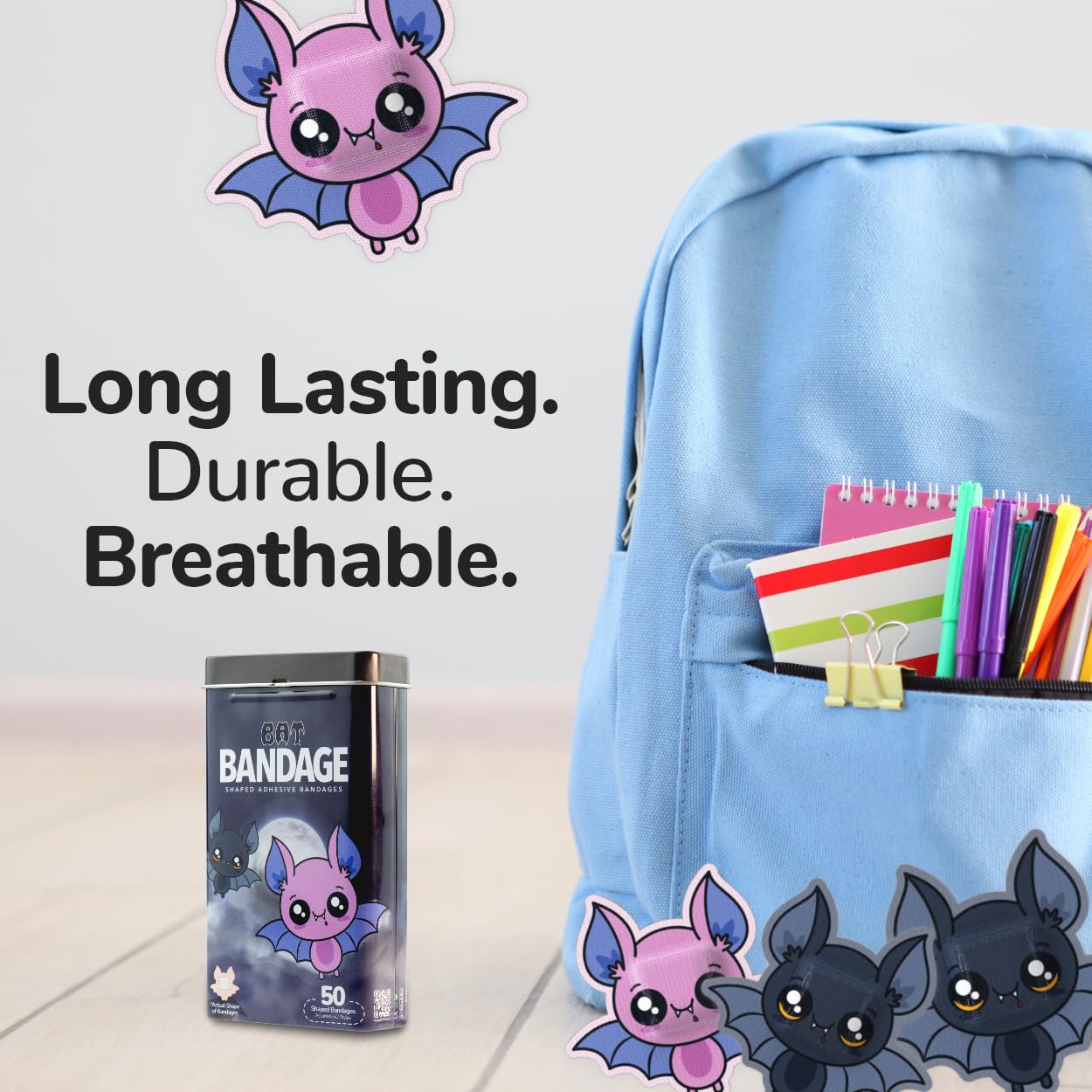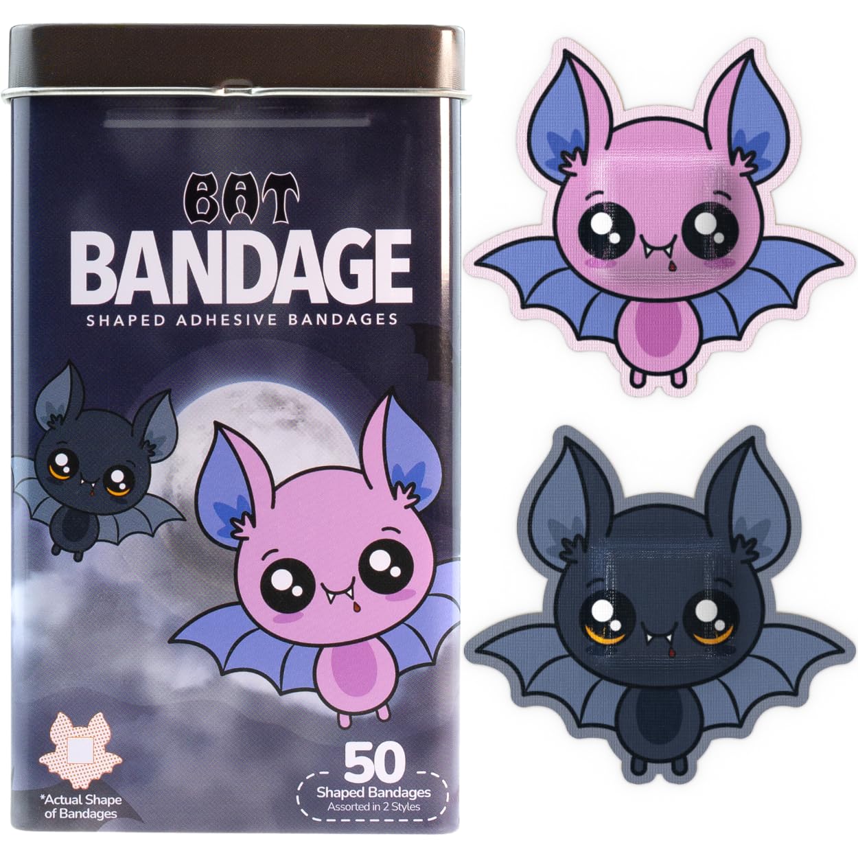 50 HALLOWEEN BATS KIDS BANDAGES: Fun bat-shaped adhesive bandages tin helps protect cuts, scrapes, and minor wounds while making healing less stressful for children; bandages come in 2 assorted styles