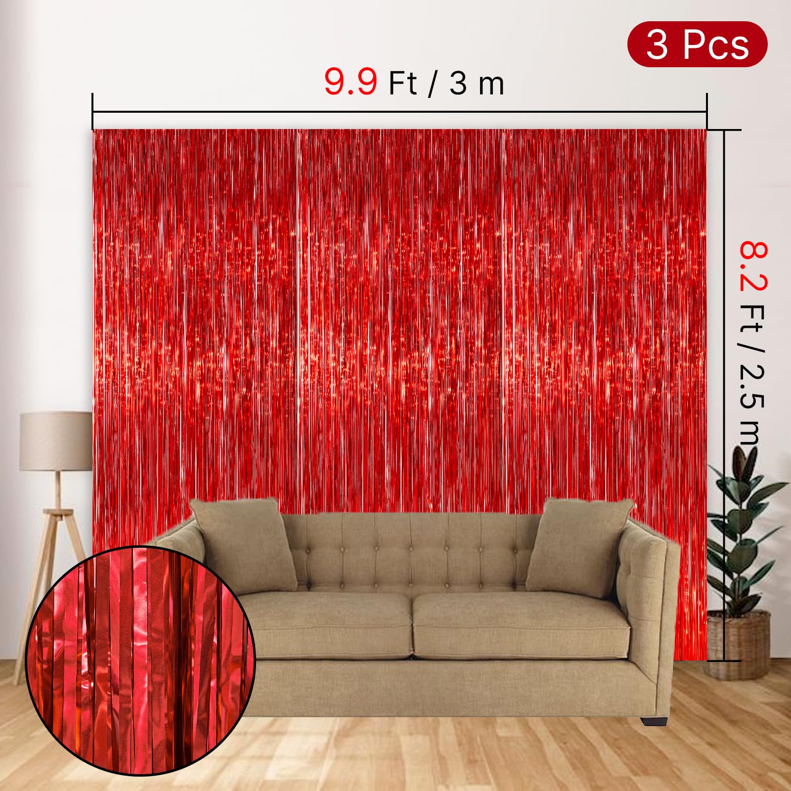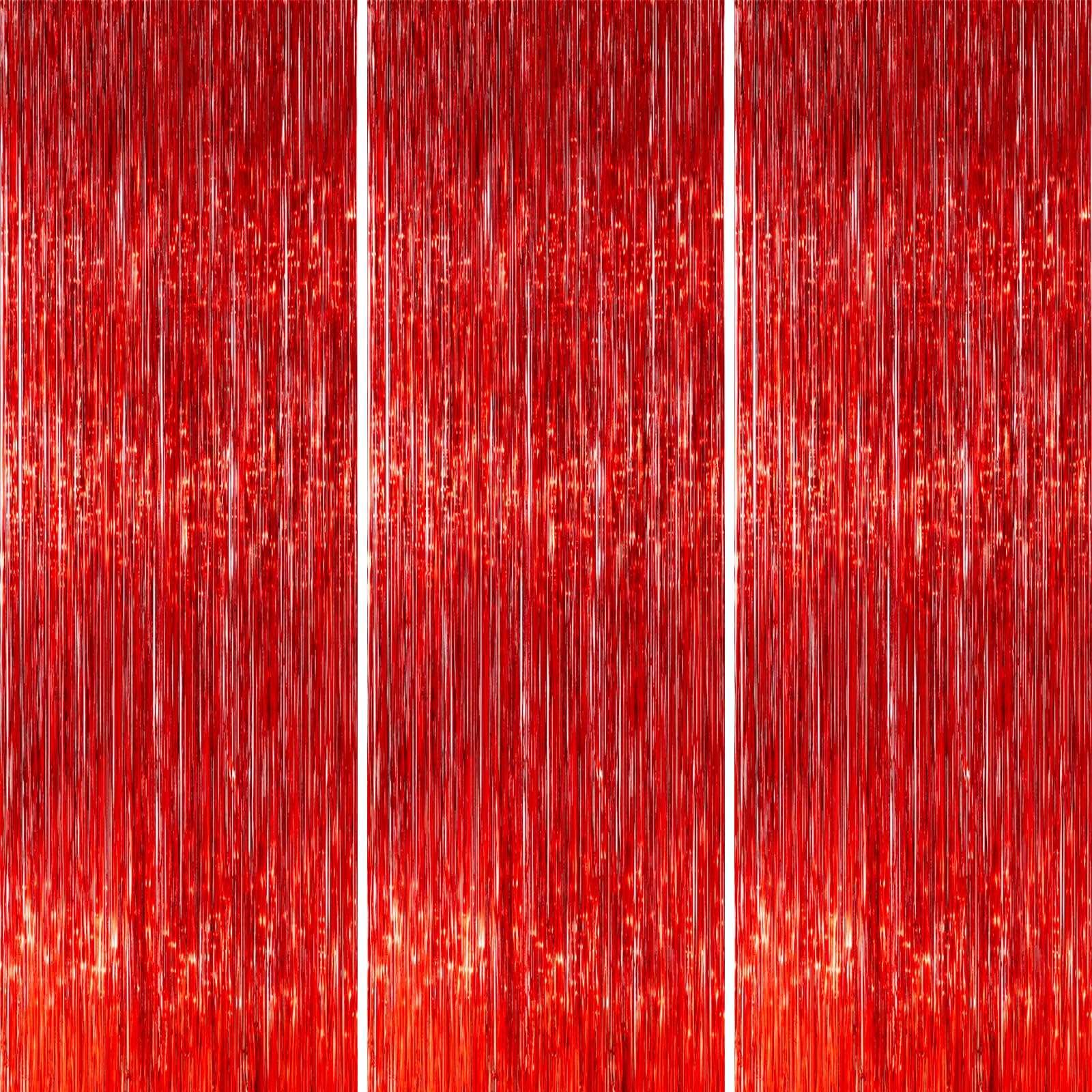 Package Included:3 pcs red foil fringe curtains [8.2×3.3ft,total 27 sq ft]. Equipped with double-sided adhesive tape, these fade-resistant foil curtain backdrops can be easily cut and adjusted to fit various party decoration requirements