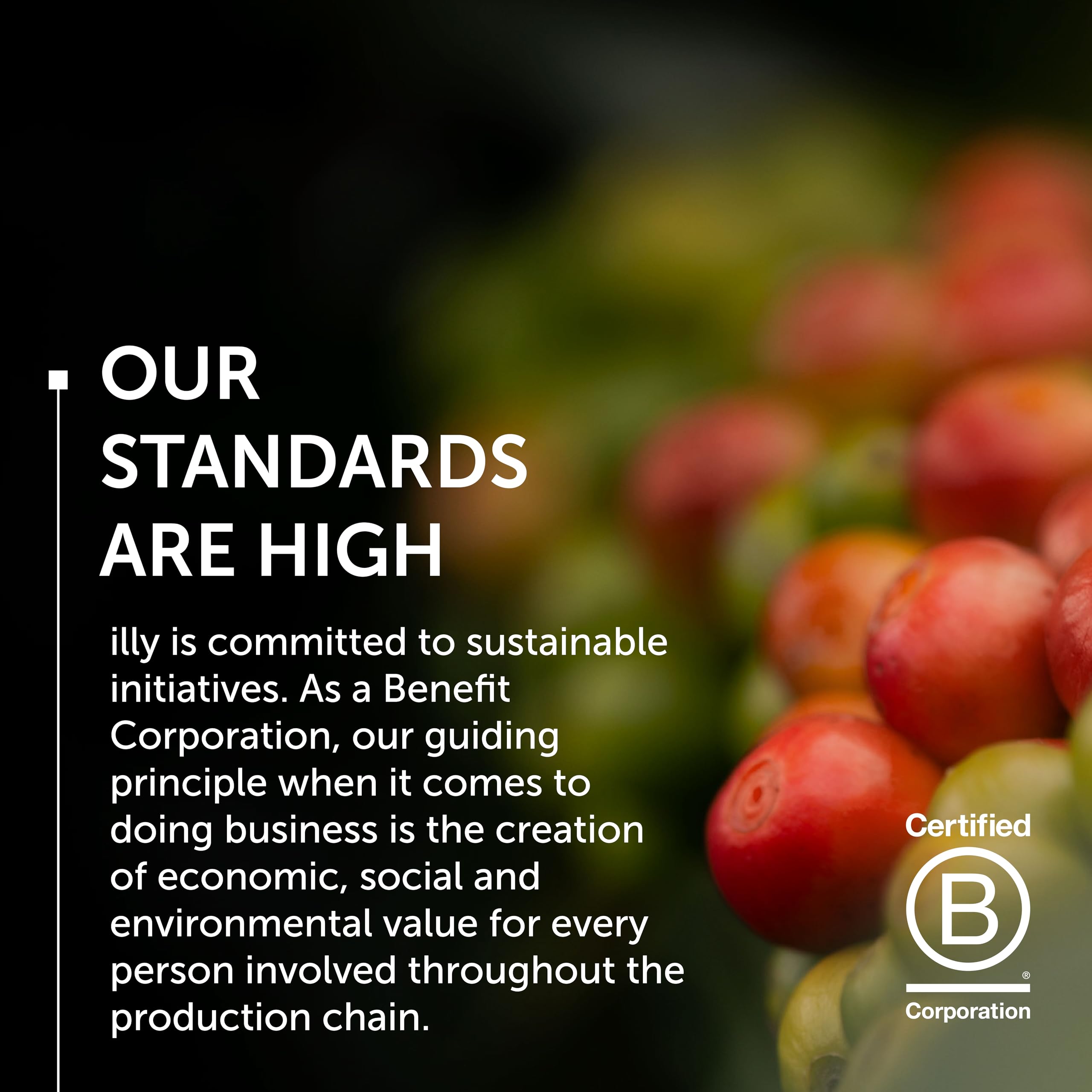 Certified B Corp: illy is committed to sustainable initiatives, as the first Italian coffee company awarded a B Corp Certification, we strive to create positive economic, social, and environmental value for everyone involved in the production chain.