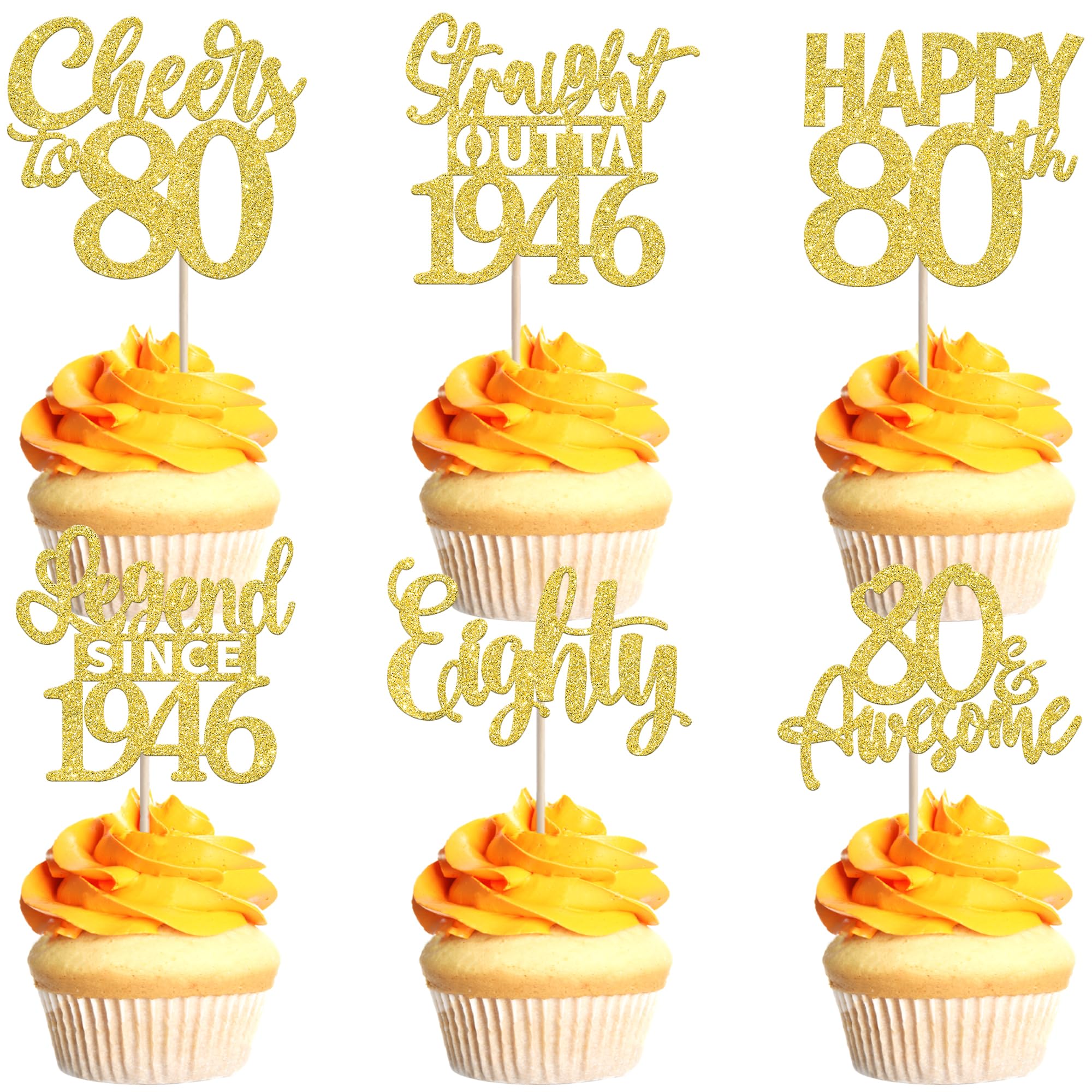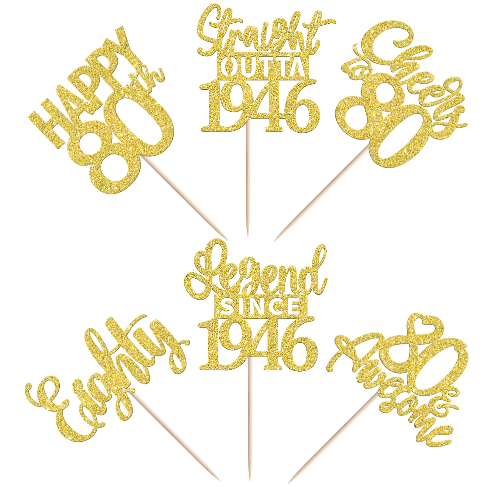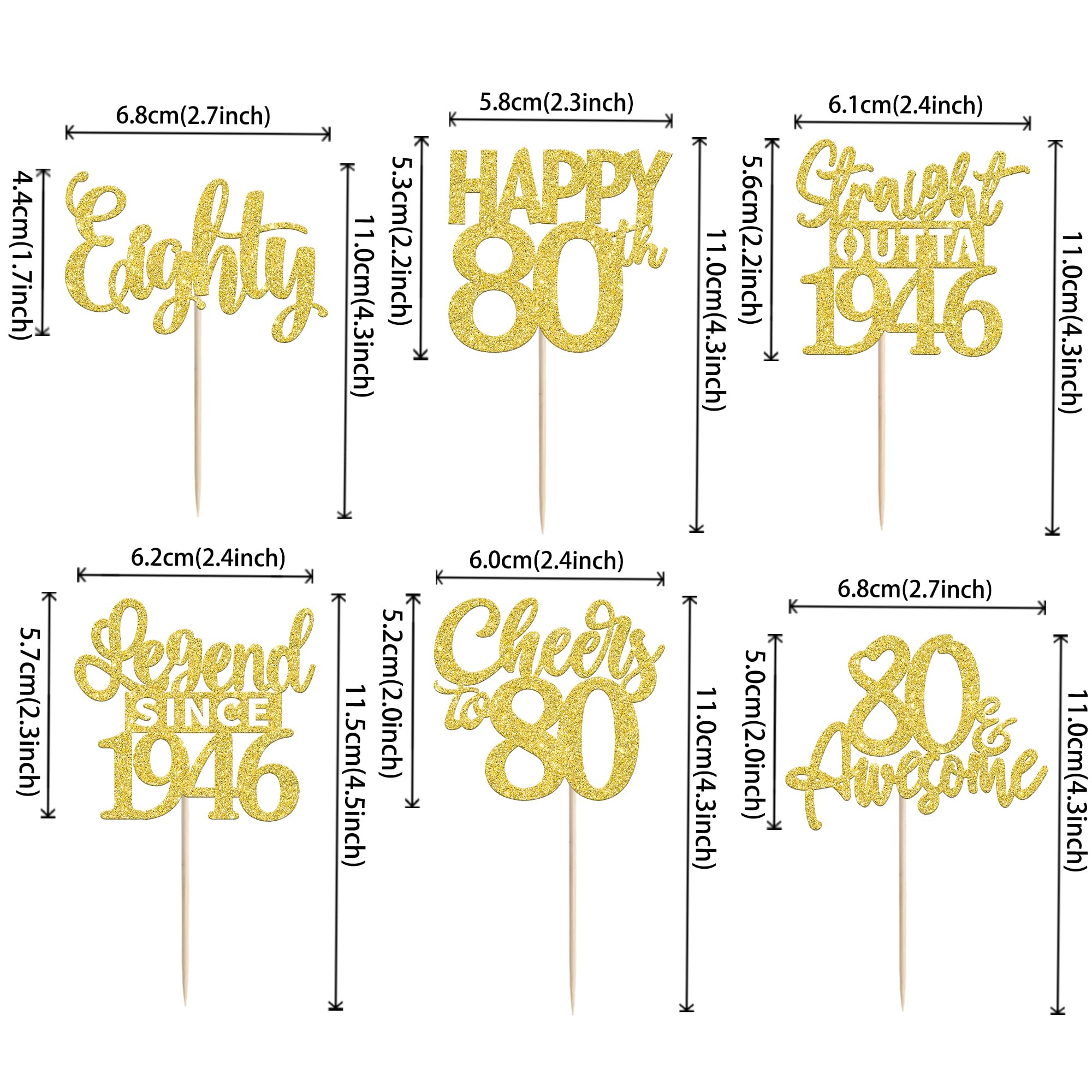 24PCS Happy 80th Birthday Cupcake Toppers Eighty Straight Outta 1946 Cupcake Picks Cheers to 80 Birthday Decorations Lengend Since 1946 Cupcake Decorations for 80th Birthday Anniversary Party Cake Decorations Supplies Perfect for legend since 1946 theme party, 80th anniversary theme party,cheers to 80 years theme party, 80 awesome theme party cupcake decorations supplies. Pack of 24 pcs,4 pcs of each design. The size is 2.3*4.5/ 2.4*4.5/ 2.7*4.5/ 2.4*4.7/ 2.6*3.9/ 2.4*4.7 inch ( with stick ) Made of high quality paper card stock,thick and sturdy. These straight outta 1946 cupcake toppers are one side glitter, another side is white, and they are intended for decoration only, please do not put them in oven or microwave. If the item you received has any defects, please contact us immediately.we will deal with it within 24 hours.