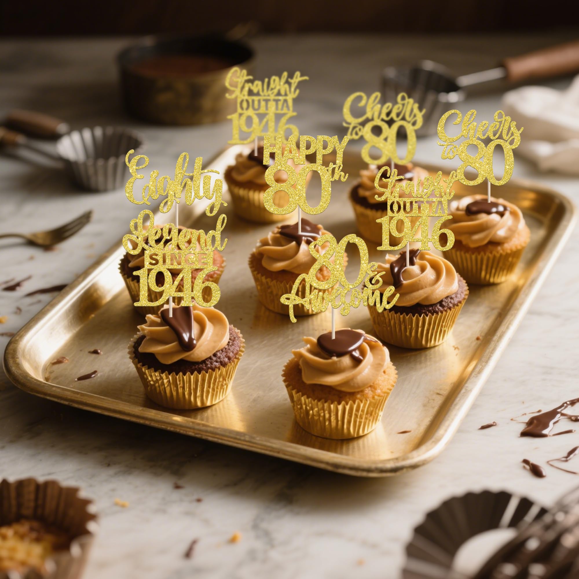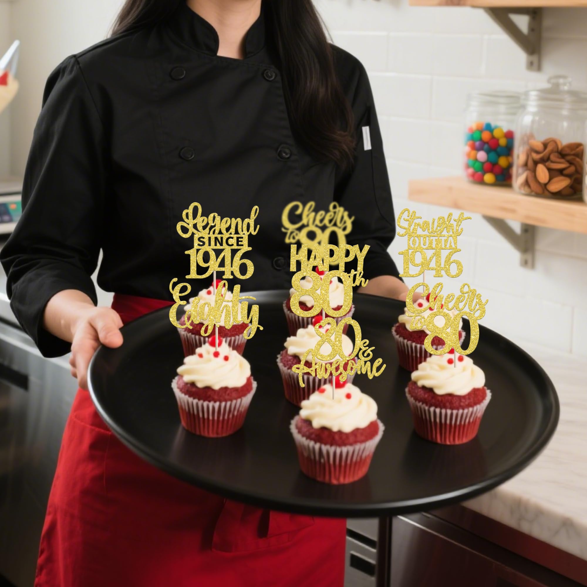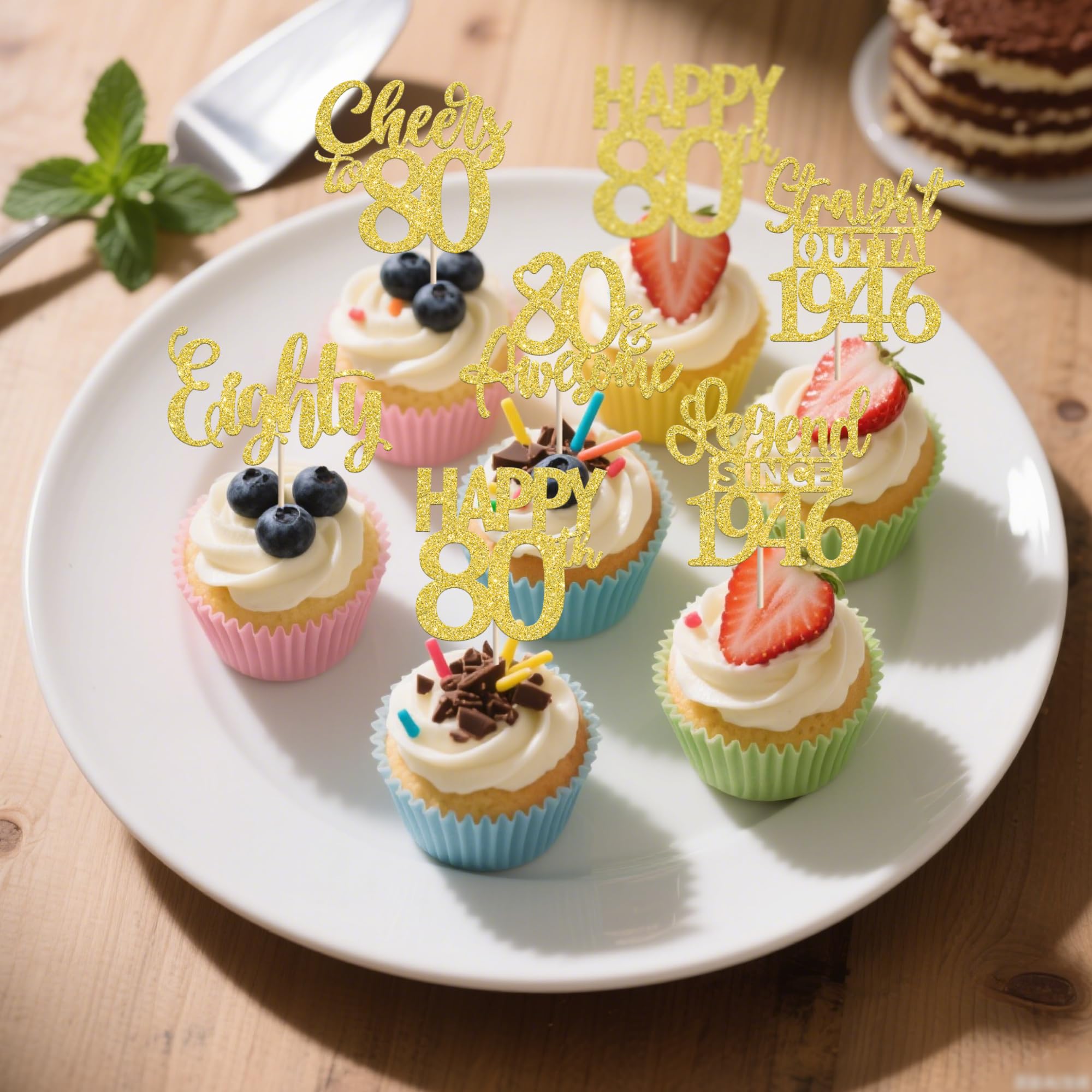 24PCS Happy 80th Birthday Cupcake Toppers Eighty Straight Outta 1946 Cupcake Picks Cheers to 80 Birthday Decorations Lengend Since 1946 Cupcake Decorations for 80th Birthday Anniversary Party Cake Decorations Supplies Perfect for legend since 1946 theme party, 80th anniversary theme party,cheers to 80 years theme party, 80 awesome theme party cupcake decorations supplies. Pack of 24 pcs,4 pcs of each design. The size is 2.3*4.5/ 2.4*4.5/ 2.7*4.5/ 2.4*4.7/ 2.6*3.9/ 2.4*4.7 inch ( with stick ) Made of high quality paper card stock,thick and sturdy. These straight outta 1946 cupcake toppers are one side glitter, another side is white, and they are intended for decoration only, please do not put them in oven or microwave. If the item you received has any defects, please contact us immediately.we will deal with it within 24 hours.