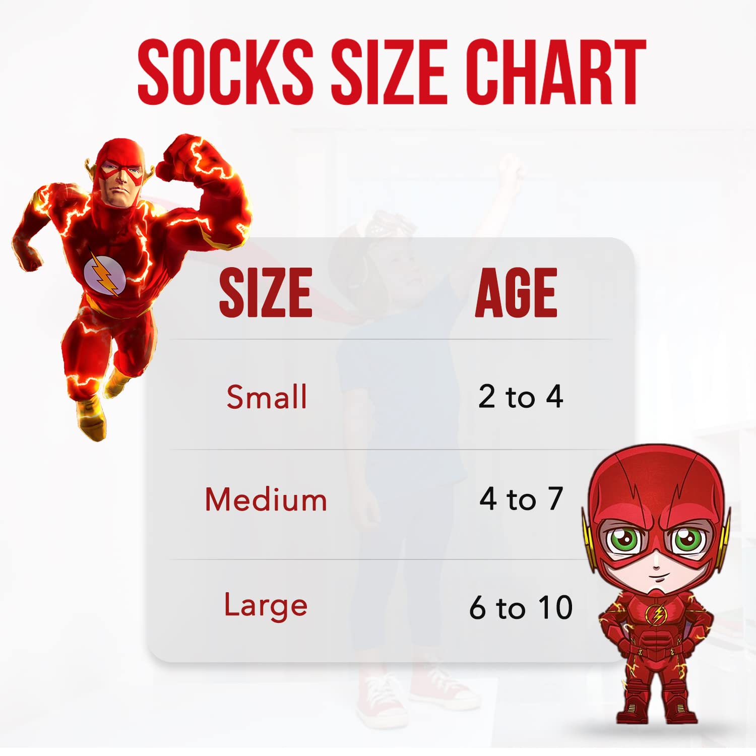 Pick Your Size-Our Flash dc comics kids socks fit boys in ages 2-4, 4-7 and even 6-10. Enjoy our justice league the flash socks for toddlers and kids crew socks in the perfect size.
