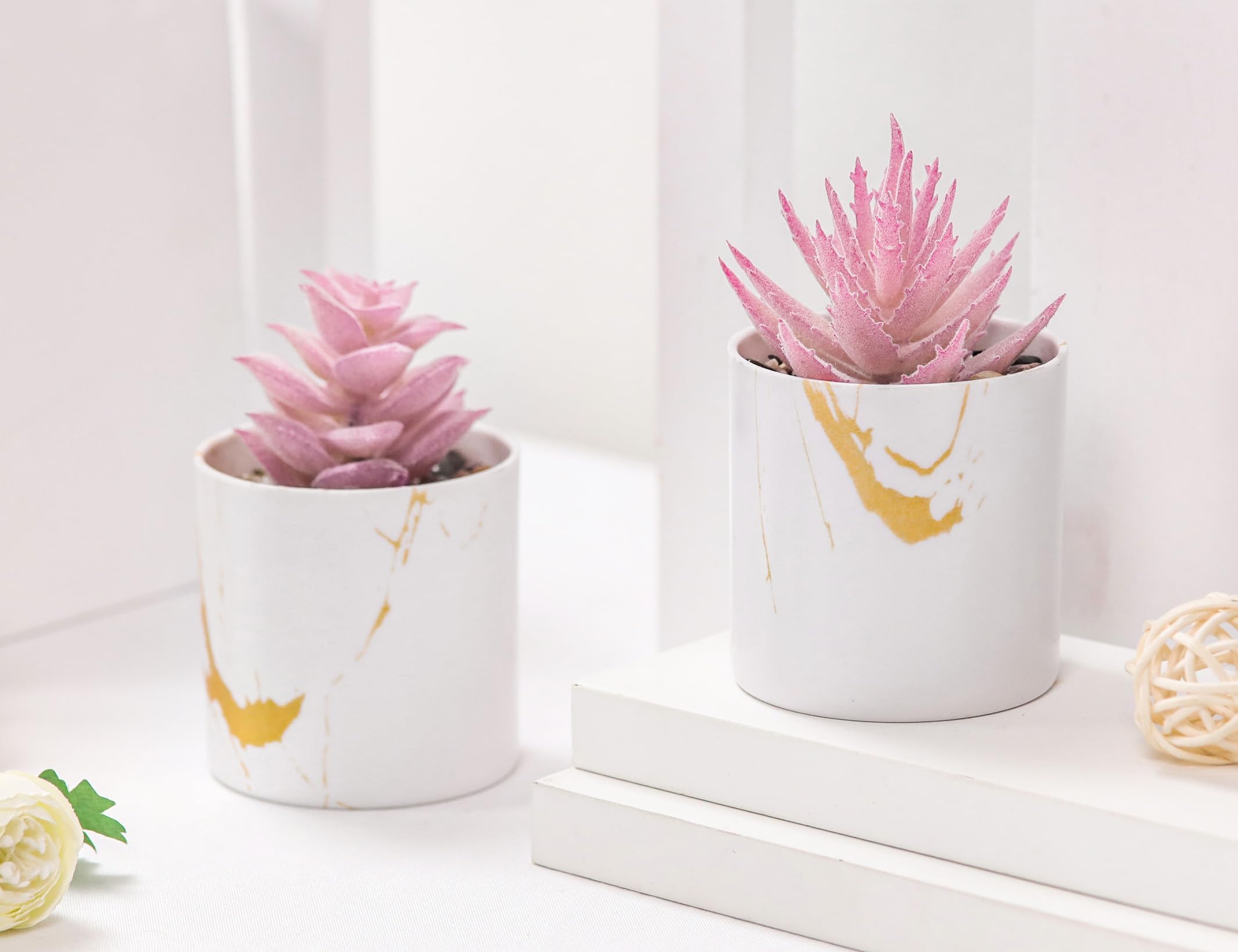 Unique Potted Plant Design: Our mini artficial plants indoor are simulated with bright colors, fine workmanship and realistic appearance. These faux plants indoor are placed in a white plastic pot with gold stripes. There are small pebbles on it, which makes the fake succulents plants look lifelike