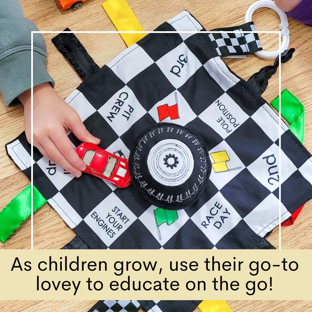 Tag Along With Baby Jack & Co Sensory Toys About the Brand: The Learning Lovey Collection by Baby Jack was created by mom inventor Kelley Legler and her two kids, Jack and Bailey. Kelley turned Jack and Baileyβs inspirational crayon drawings into cute fabric textiles. With that, the Baby Jack & Co Learning Lovey Collection was born! Show your love of sports and racing with our unique Racing Lovey! The Racing Lovey is the perfect security blanket that lasts forever and encourages your baby MVP to fall in love with your favorite teams and games. Magical Product Benefits: Baby Jack & Co sewn-shut baby toys provide sensory play and stimulation to help aid in the development of all five senses: touch, taste, smell, sight, and sound. Sensory play is essential for growth and meeting milestones and can help little ones and children grow cognitively, socially, and emotionally. Safety Is Our Priority: All Learning Loveys are known for being the only preemie toys with their ribbons sewn shut for added safety. After seeing her son get his finger intertwined in a looped ribbon tag blanket, Kelley knew this added safety feature was a must-have in keeping kidsβ fingers, toes, and even tongues safe from getting caught. FAQ: Q: Is it washable? A: Yes. Machine wash in cold and air dry. Some families use it as a fun bath toy too! Q: What are the dimensions of the clips? A: 3 to 4 inches wide. Q: Whatβs the best age for this product? A: It's an excellent gift for a newborn, tummy time toy, 3m (grabbing and chewing), or 6m sensory play. Since this has educational appeal, this can grow with a child through preschool and elementary ages. Specifications: BPA Free 1 x 10x10 Inch Sensory Blanket 1 x Toy Link Clip Cute Sports Pattern Give your little one the gift of comfort and security with a lovey blanket. Check out our storefront for our full selection of patterns and sizes.