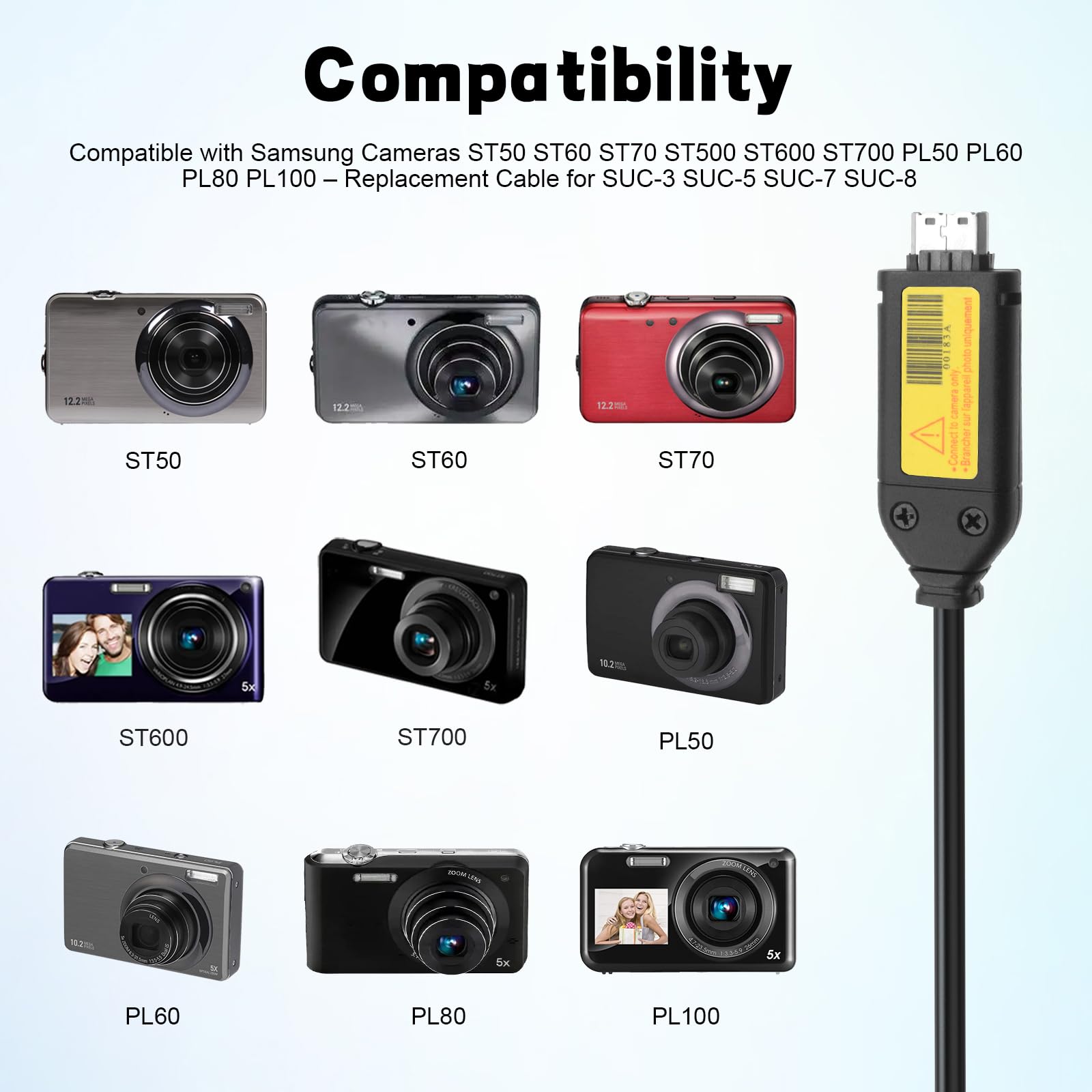 Compatible with Samsung ST10 ST30 ST45 ST50 ST60 ST61 ST65 ST70 ST71 ST80 ST90 ST93 ST95 ST500 ST600 ST700 ST5000 ST5500 ST6500 PL20 PL10 PL50 PL51 PL55 PL60 PL65 PL80 PL100 PL101 PL150 PL170 PL200 PL210 PL120 PL57 PL70 PL81 PL151 etc. Perfect replacement cable for keeping your camera ready anytime.