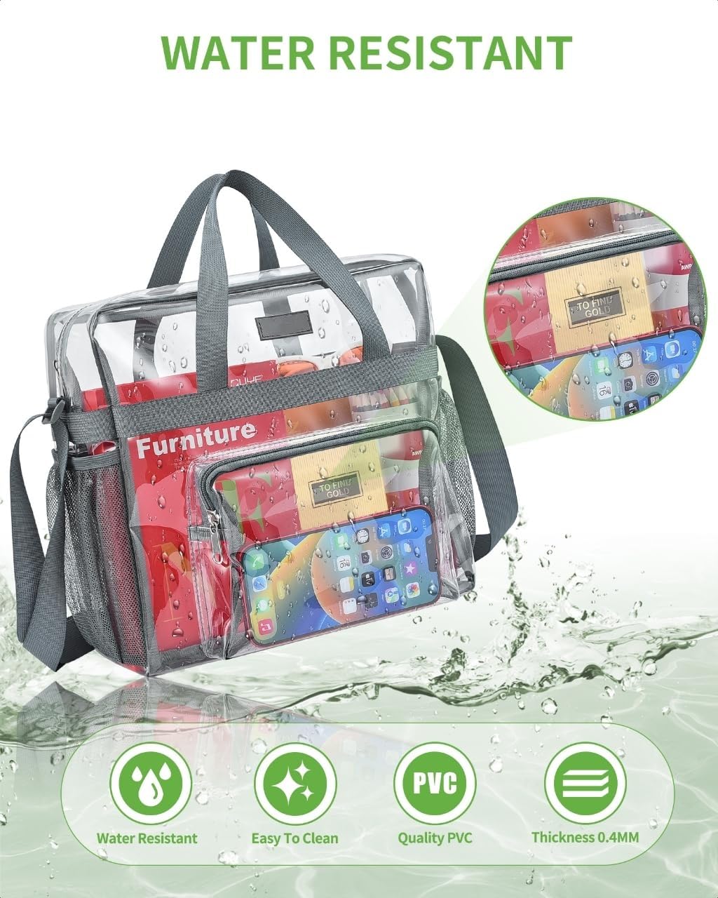 【Sturdy Material】The clear tote bag with adjustable strap is made of non-odorous transparent thickened PVC material. Reinforced seams make it more sturdy to hold heavy loads, avoding tearing aprt.