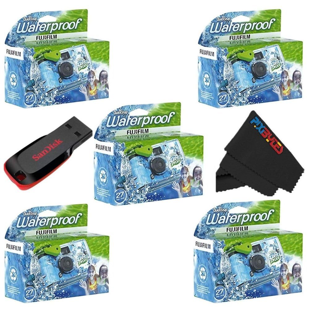 Bundle Includes: Fujifilm Quick Snap Waterproof 35mm Single Use Camera, Sandisk 32 GB USB Flash Drive, and Pixibytes Microfiber Cleaning Cloth