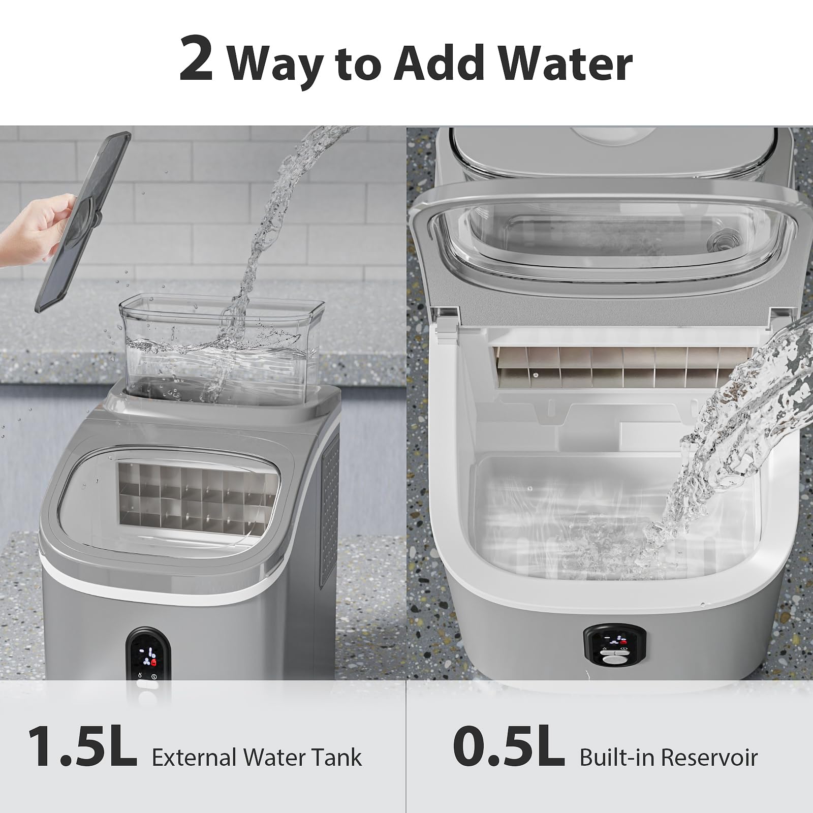 ใTwo Convenient Water Fill Optionsใ Flexibility for Any Situation! Add water easily through the dedicated 1.5L external removable water tank or directly into the 0.5L top-opening reservoir. This dual-design minimizes refills and provides convenience, allowing you to choose the best method for your kitchen setup and keep the ice production flowing.