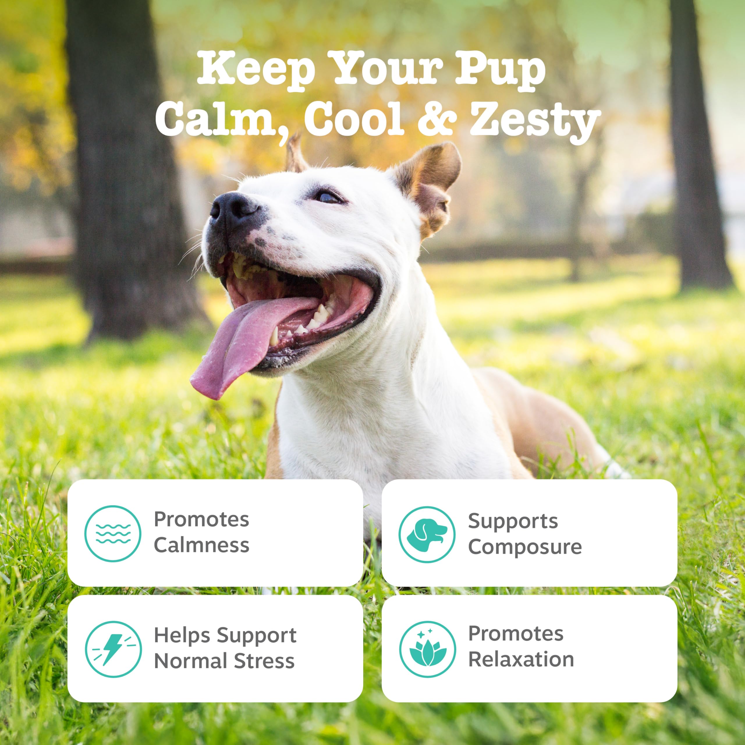 Featuring Suntheanine - Every chew contains Suntheanine, a clinically studied and super premium form of L-Theanine that helps promote a sense of relaxation and calmness for your pup.