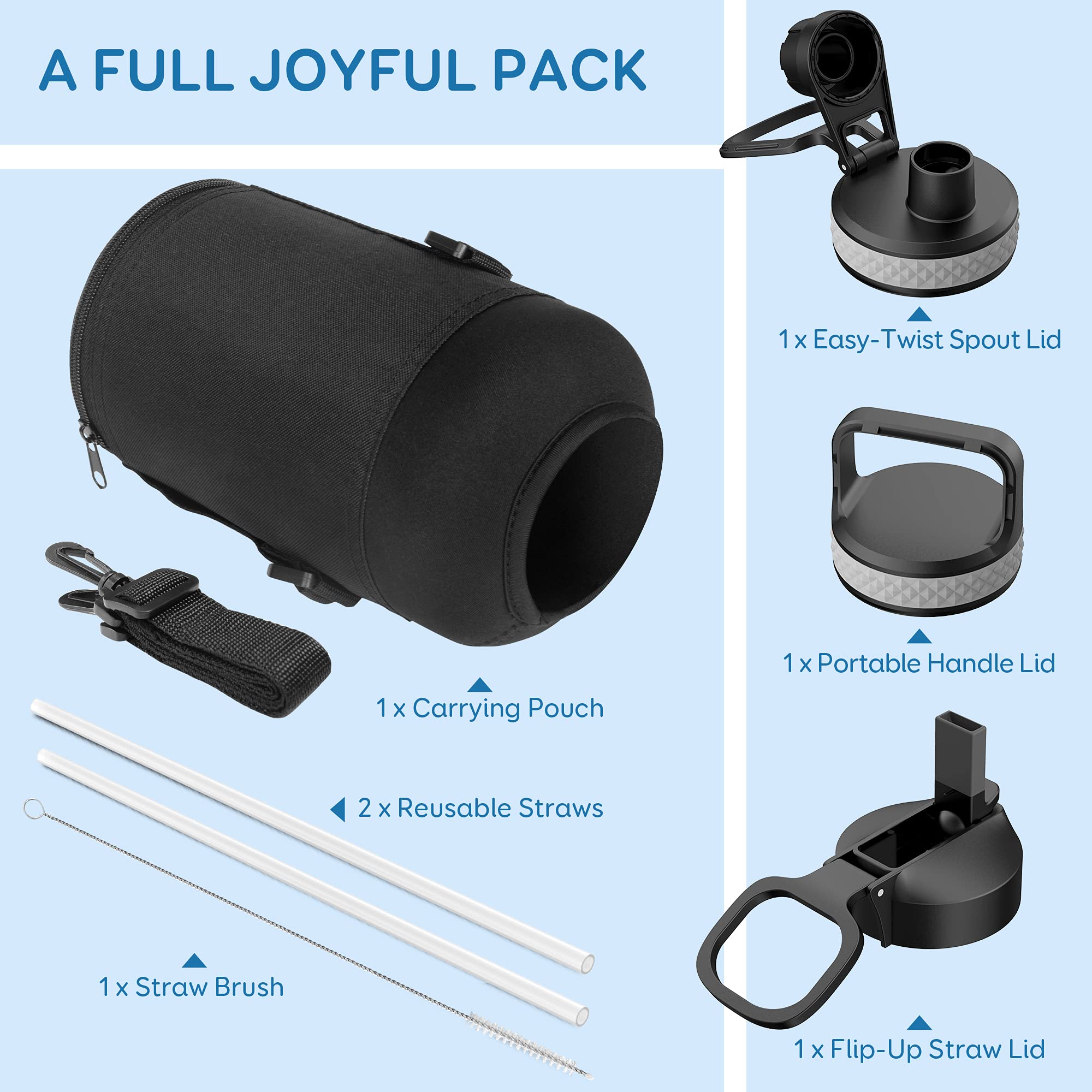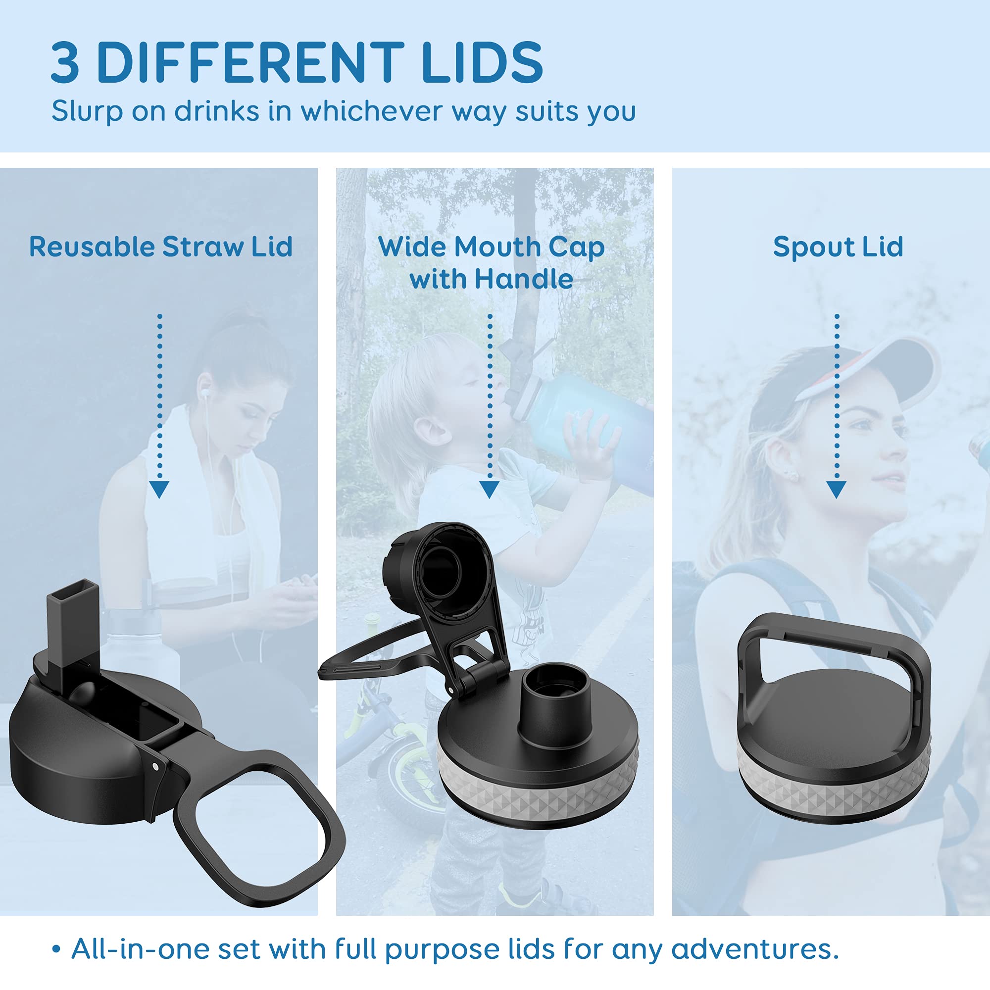 Flexible Drinking On-the-Go: This water jug comes with 3 different lids. The screw-on lid with flip-up handle is for easy ice refilling with superior portability; spout lid makes it convenient to drink hot liquid and straw lid for sipping cold.