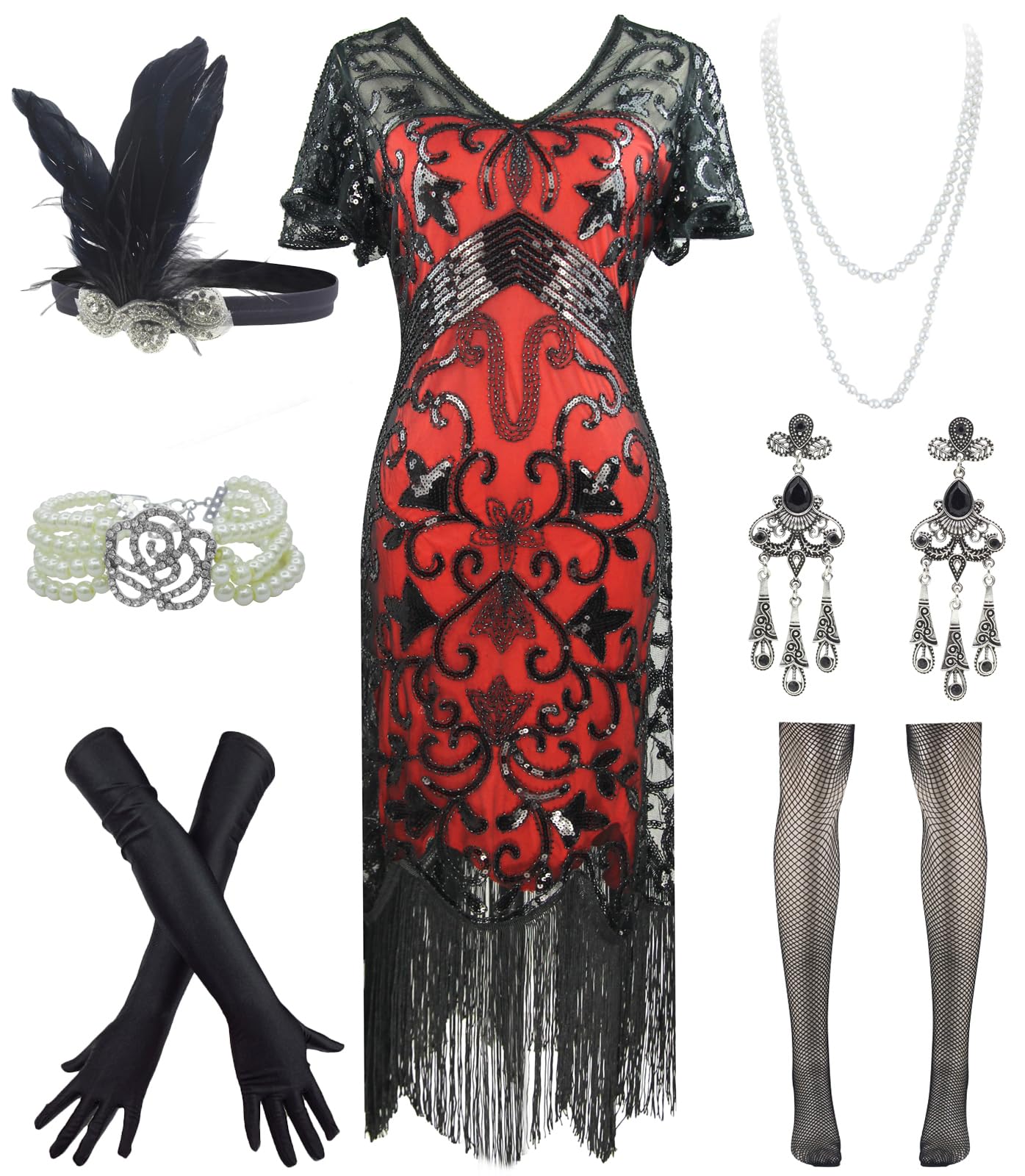 Package:1 x Sequin Dress, 1 x Cigarette Holder, 1 x Long Satin Glove, 1 x Feather Headband, 1 x Pearl Necklace, 1 x Earring, 1 x Pearl Bracelet, 1 x Fishnet stockings