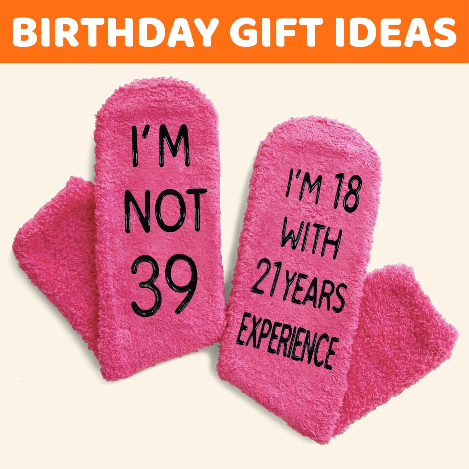 39TH BIRTHDAY GIFT IDEAS: Celebrate with our "I'M NOT 39, I'M 18 WITH 21 YEARS EXPERIENCE" socks, good for any occasion. They are ideal for Birthday presents, Christmas surprises, or playful White Elephant gifts. Make every holiday memorable with this fun and thoughtful gesture.