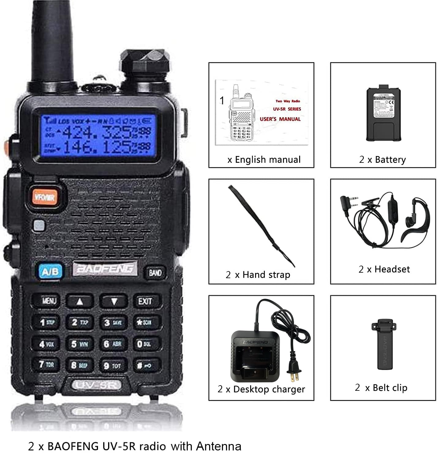 What's in the package? 2 x BAOFENG UV-5R radio with antenna, 2 x 1800mAh Li-Ion battery, 2 x Headset, 2 x Desktop charger, 2 x Belt clip, 2 x Hand strap, 1 x English manual.