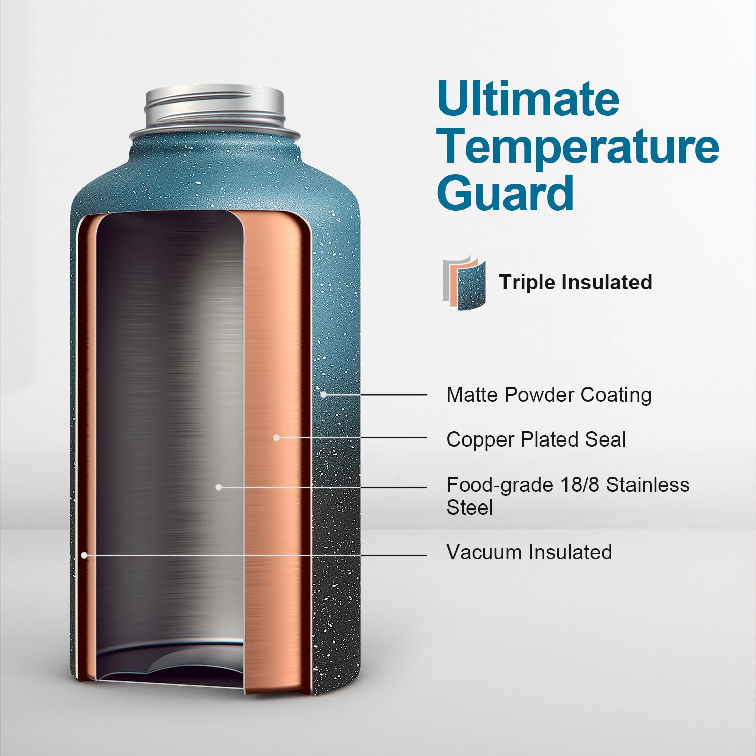 【Vacuum Insulated】This half gallon water bottle is made of copper-plated stainless steel with a double-wall vacuum structure, which keeps cold for up to 48 hours and hot for 24 hours so that every drop is refreshingly cool and true to its taste.