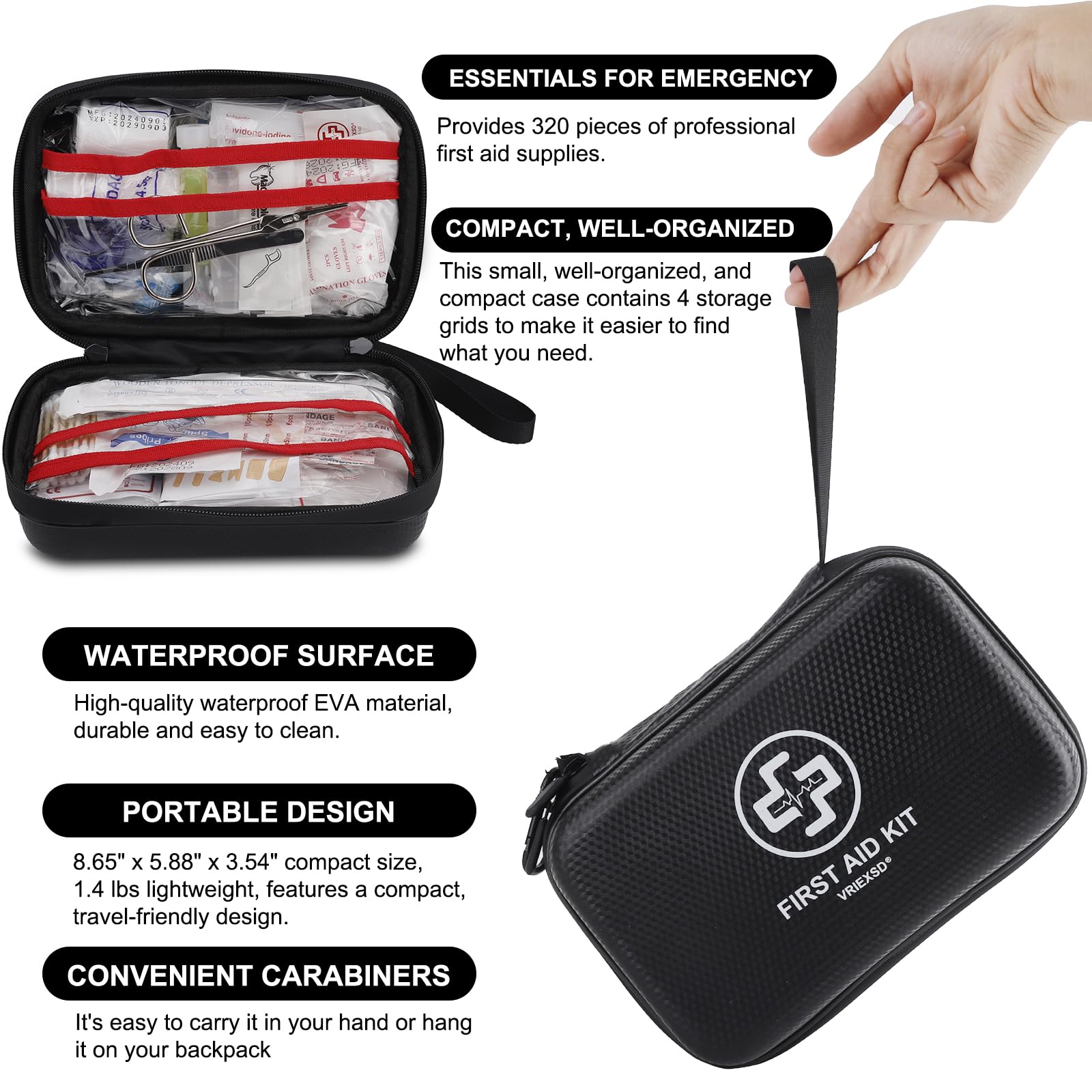PORTABLE DESIGN: 8.65" x 5.88" x 3.54" compact size, lightweight, and compact design. Premium waterproof double zippers and bonus carabiners increase convenience for outdoor activities. It's easy to hang this small emergency kit on your backpack